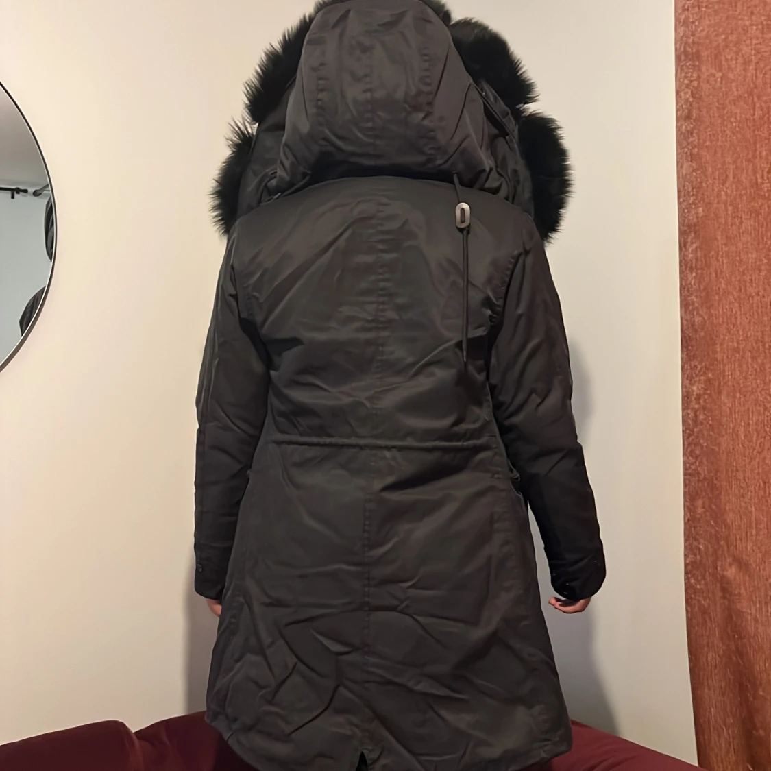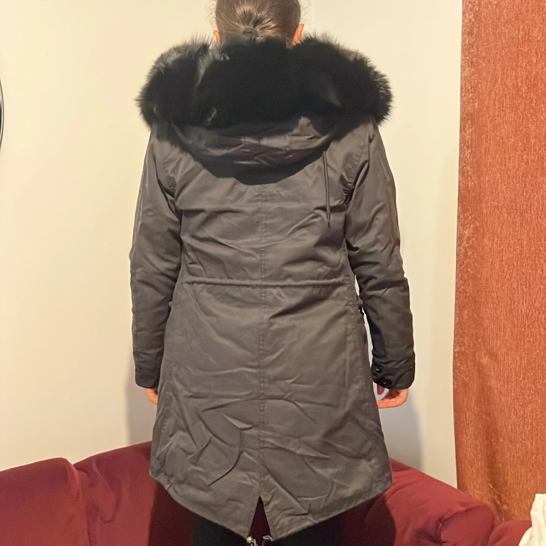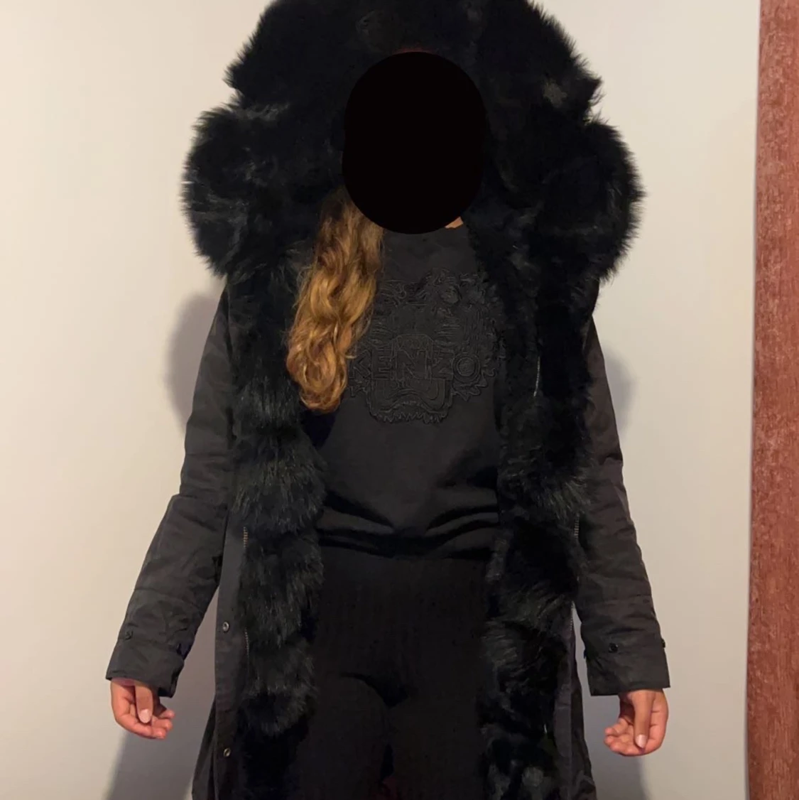En svart vinterjacka med äkta päls, varm och mysig. Pälsen som ska sitta på yttra ärmarna finns inte. Pris kan diskuteras