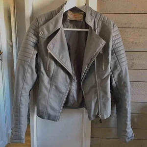 Chiquells gråa Moto Jacket. Liten i storleken. Köpt längesen och använd väl. Fint skick förutom några slitningar och några små, lösa trådar. Bild 3: mest skavt där men är på insidan armen och syns knappt. Katt finns i hemmet. 200kr + eventuell frakt.