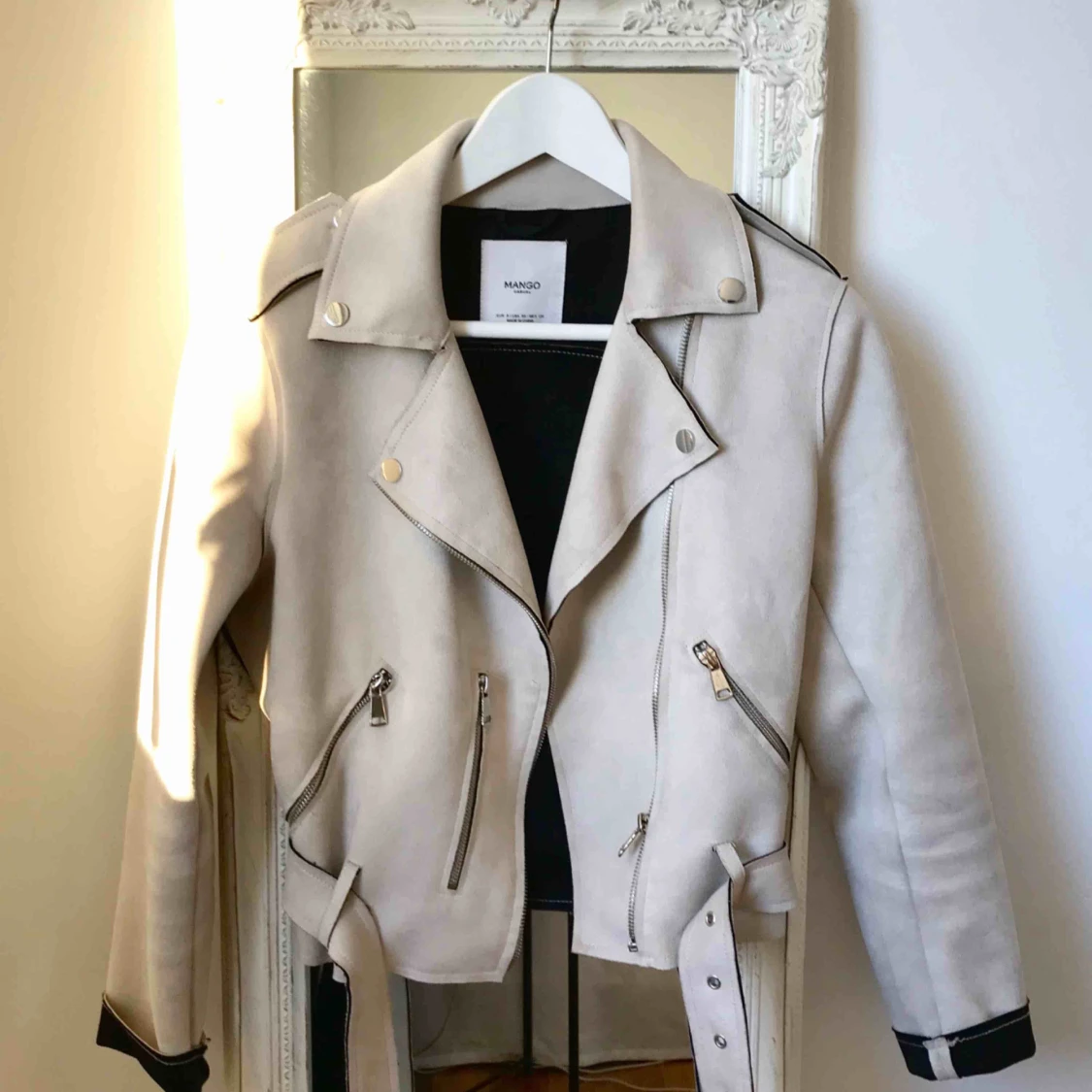 Bikerjacka från Mango i mocka. Supersnygg & i nyskick! ☺️ (den har inte rosa fläckar som det kanske ser ut på bilderna, det är solljuset som reflekteras i min rosa glaskaraff)