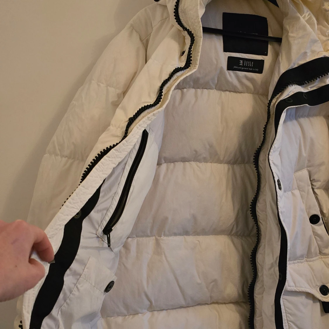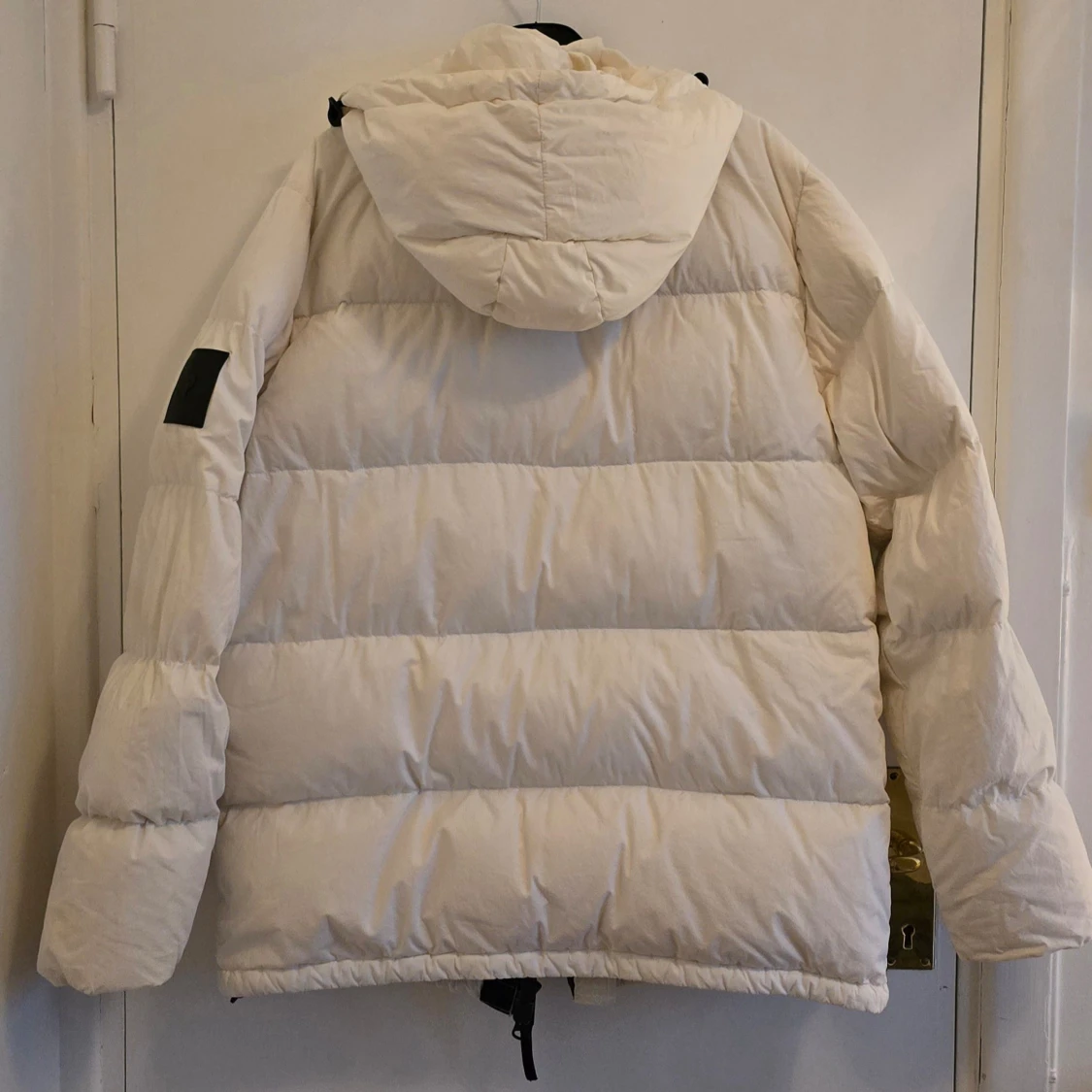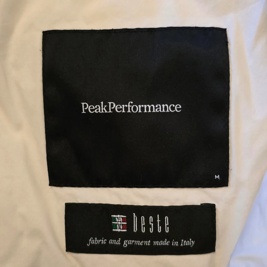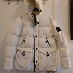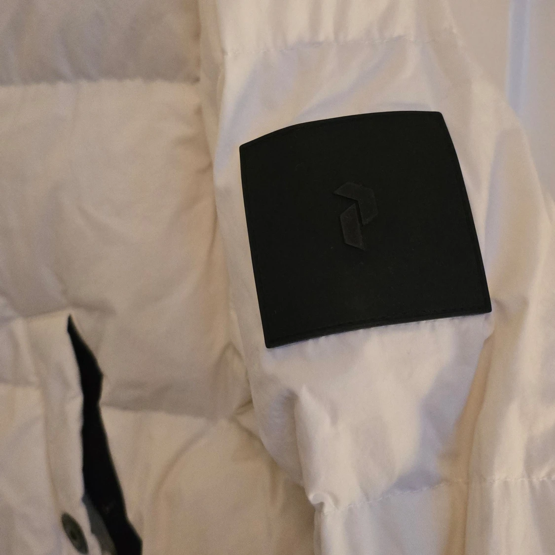 Säljer en snygg vit dunjacka från Peak Performance. Jackan har en huva och praktiska fickor med knappar. Den är långärmad och har en stilren design med en svart logotyp på ärmen. Perfekt för kalla dagar!