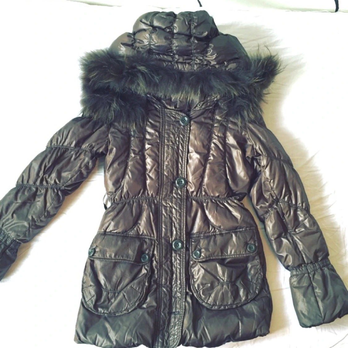 Dunjacka perfekt till vintern med pälskrage på luvan, brun färg och slutar en bit ovanför rumpan. Varm och gosig, i jättebra skick och bra pris. Den enda som saknas är bältet.
