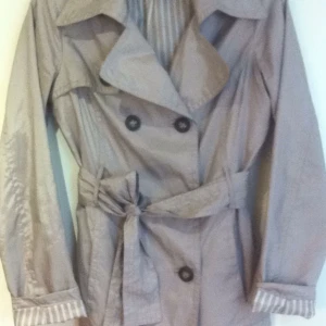 Beige vår-/höstjacka i polyester. Fickor, knappar, avtagbart knytband och små axelvaddar för bättre passform. Randigt foder. Använd ett fåtal gånger, går att handtvätta. Köpt på VILA.