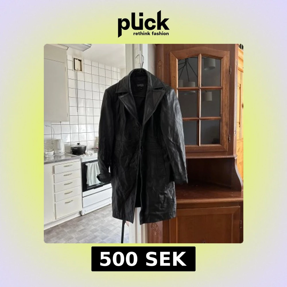 Svart, knälång soft leather kappa med krage och knäppning fram. Kappan har dekorativa sömmar och fickor fram. Knapparna fram är lite lösa så man får sy dem själv.