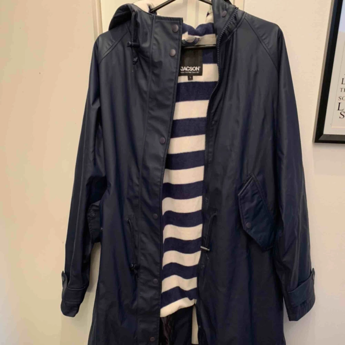 Regnkappa, använd ett fåtal ggr. Matchade med hundens regnjacka som sedan blev för liten och nu är såld. Därav säljer jag denna! Fleecefodrad inuti, lång. Strl L i Marin.
