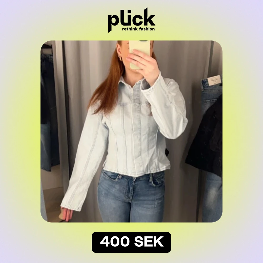 En snygg Jeans jacka som man kan använda ute som jacka men även ha som en typ jeans skjorta inomhus. Jag skulle säga att den är lite figursydd då den är lite smalare i midjan och sen går ut där nere. Den har större armar. Aldrig använd. Storlek S