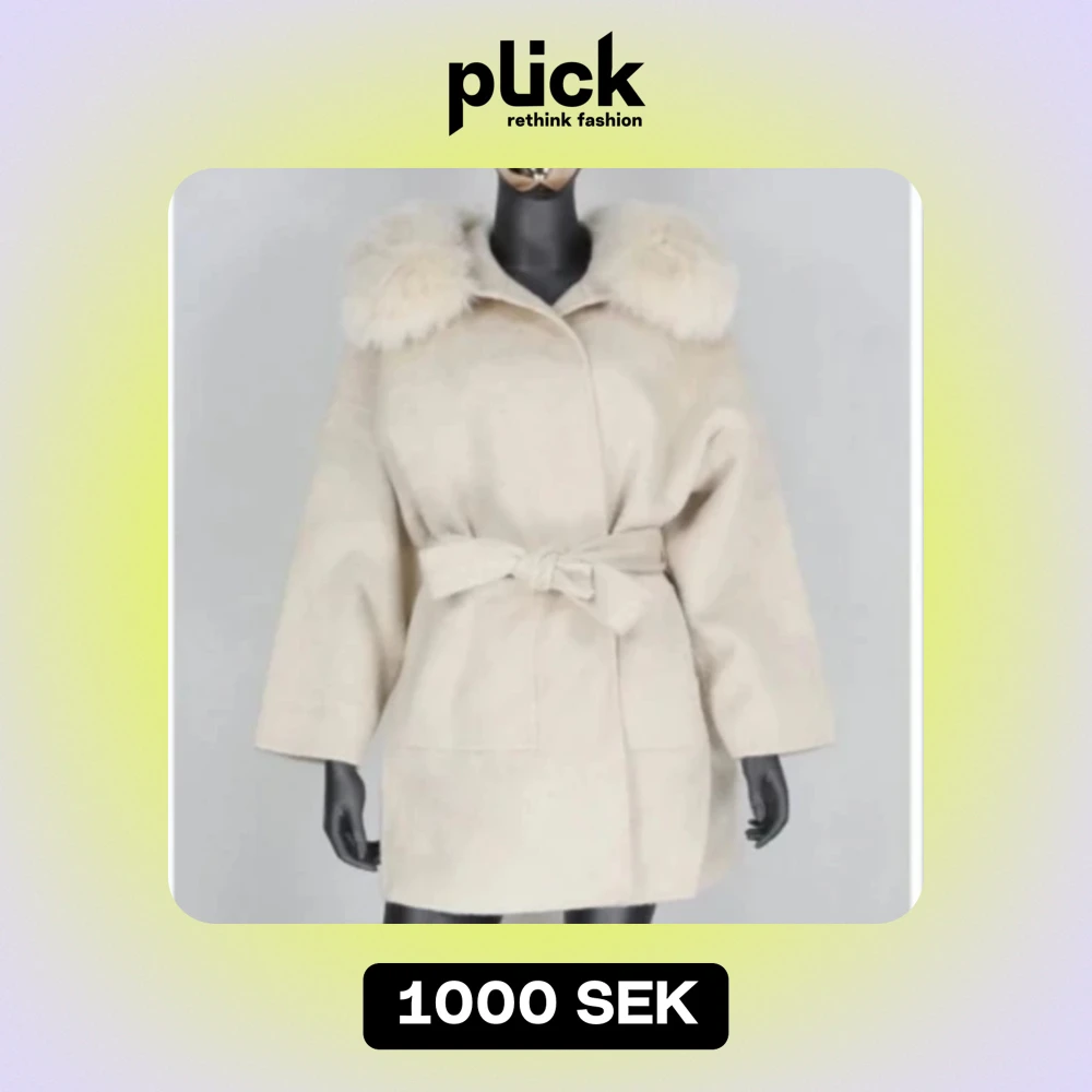 Fur Stockholm Alicia Coat off-white med pälskrage - Snygg off-white kappa från fur Stockholm med stor fluffig pälskrage och knytskärp i midjan. Jackan har raka ärmar, två fickor och en stilren, lite oversized passform. Perfekt för dig som vill ha en trendig och mysig look under kallare dagar.