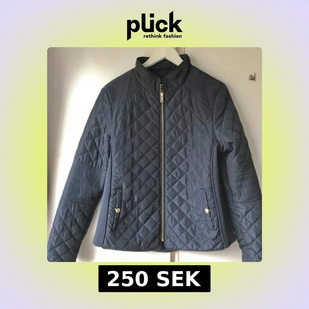 Snygg mörkblå quiltad jacka med dragkedja och ståkrage. Jackan har långa ärmar och två fickor med knappdetaljer. Perfekt för kyligare dagar och ger en stilren look.