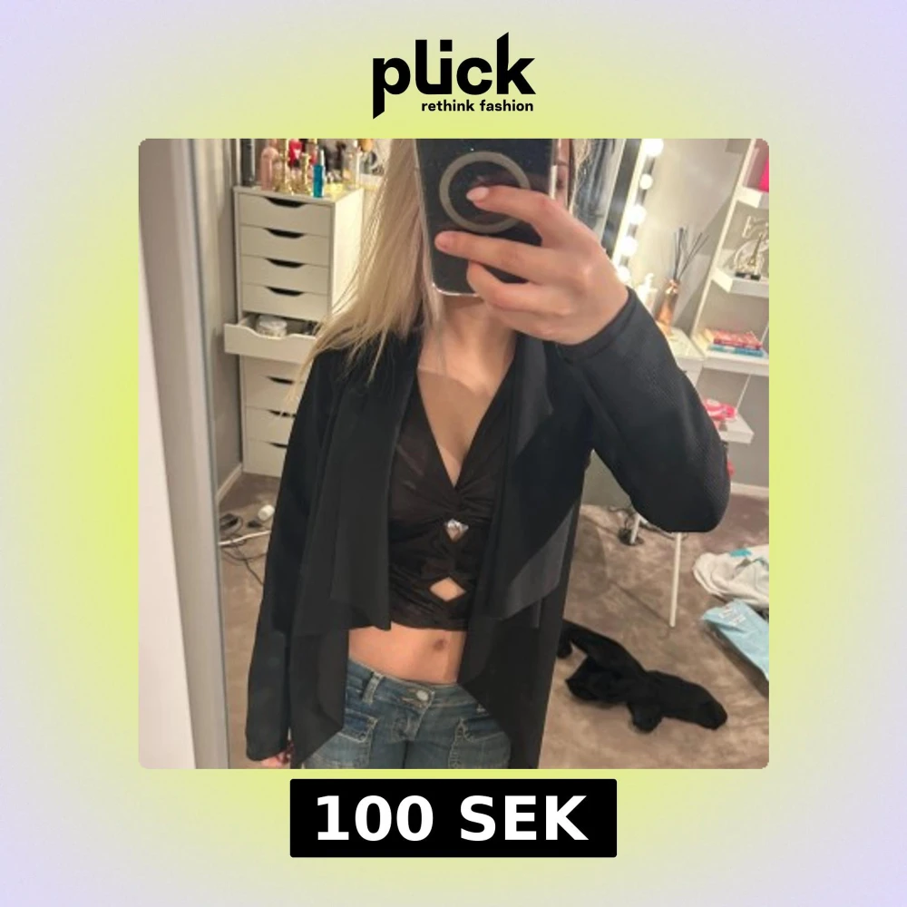 Säljer en svart omlott cardigan jacka med långa ärmar och lös passform. Jackan har ett knytband i ryggen och ett vattenfallsinspirerat fall framtill. Perfekt för lager-på-lager och enkel att styla till olika outfits.