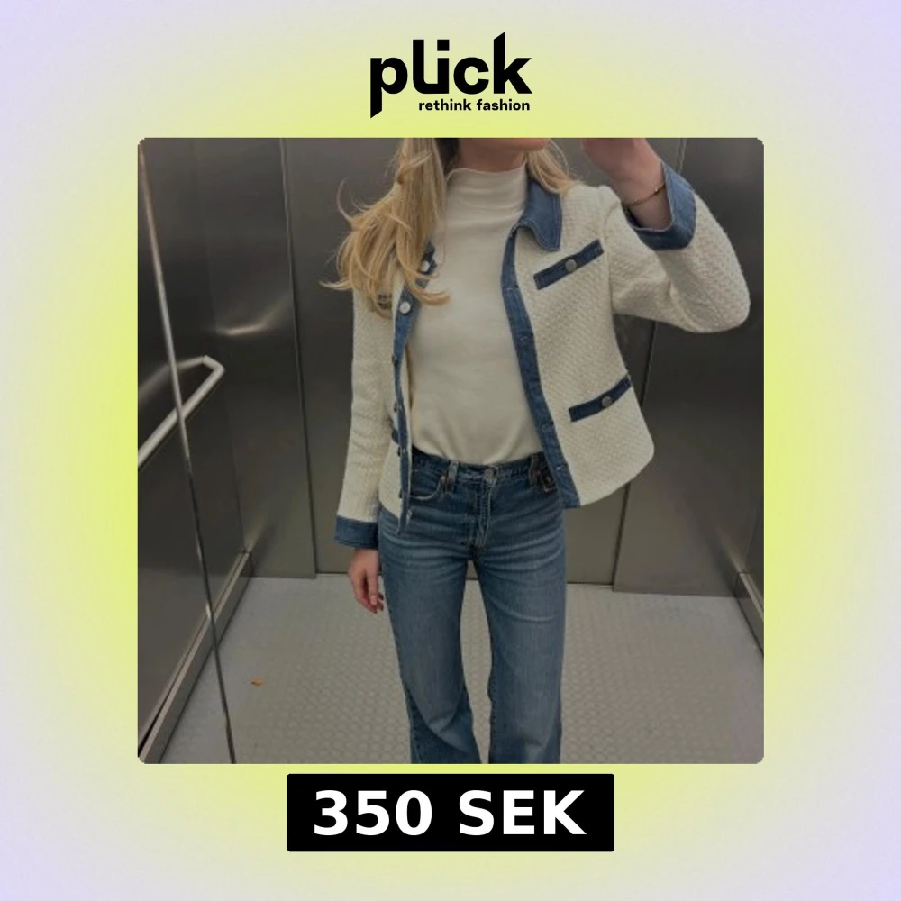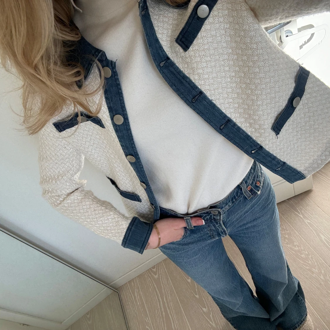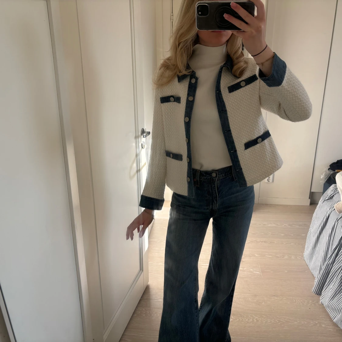 Sjukt fin kavaj med denimdetaljerđ köpt secondhand och stĂ„r tyvĂ€rr inget mĂ€rke i