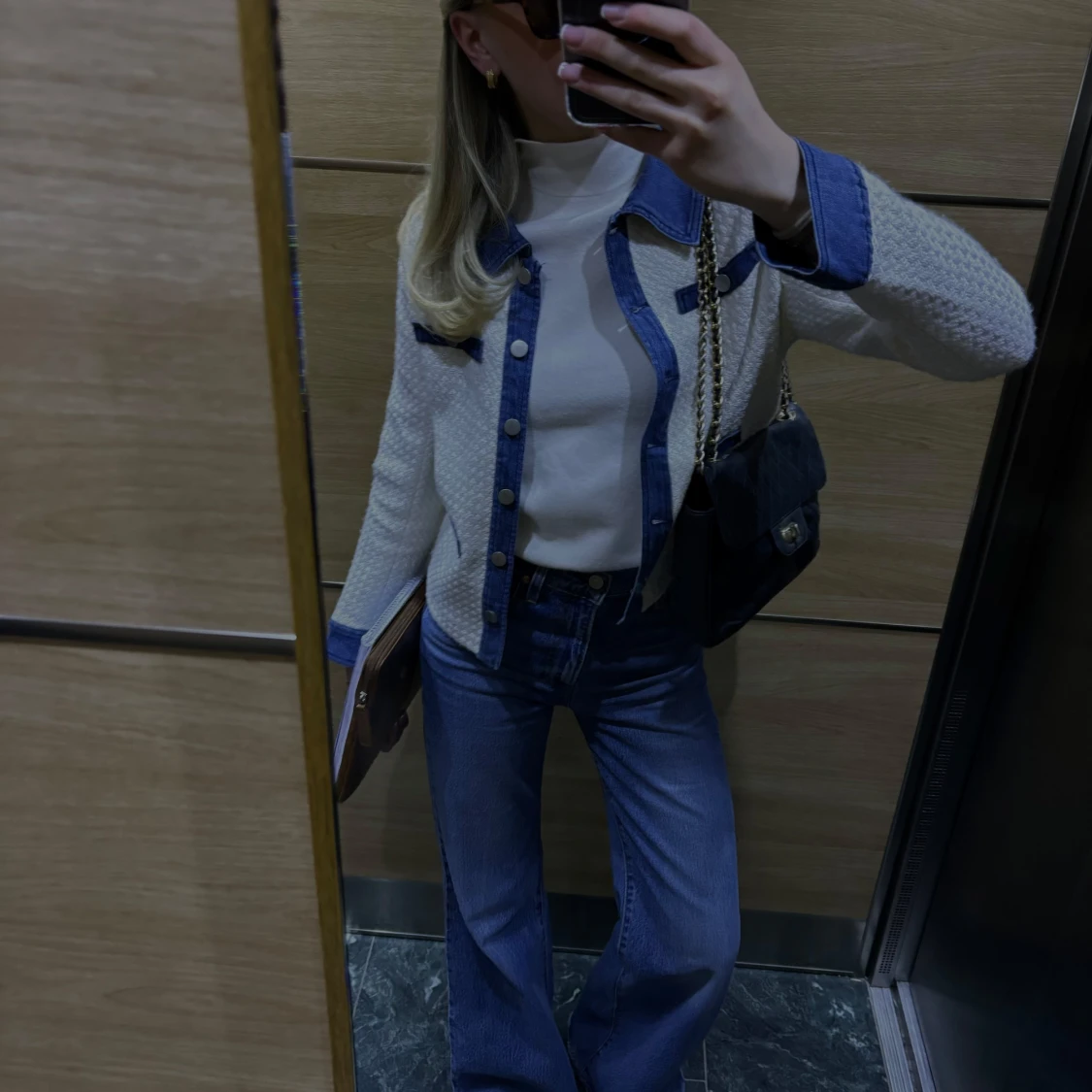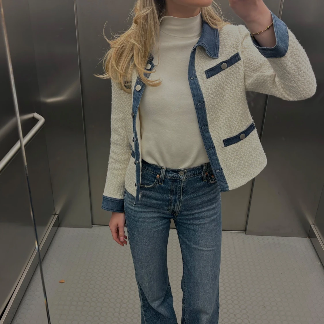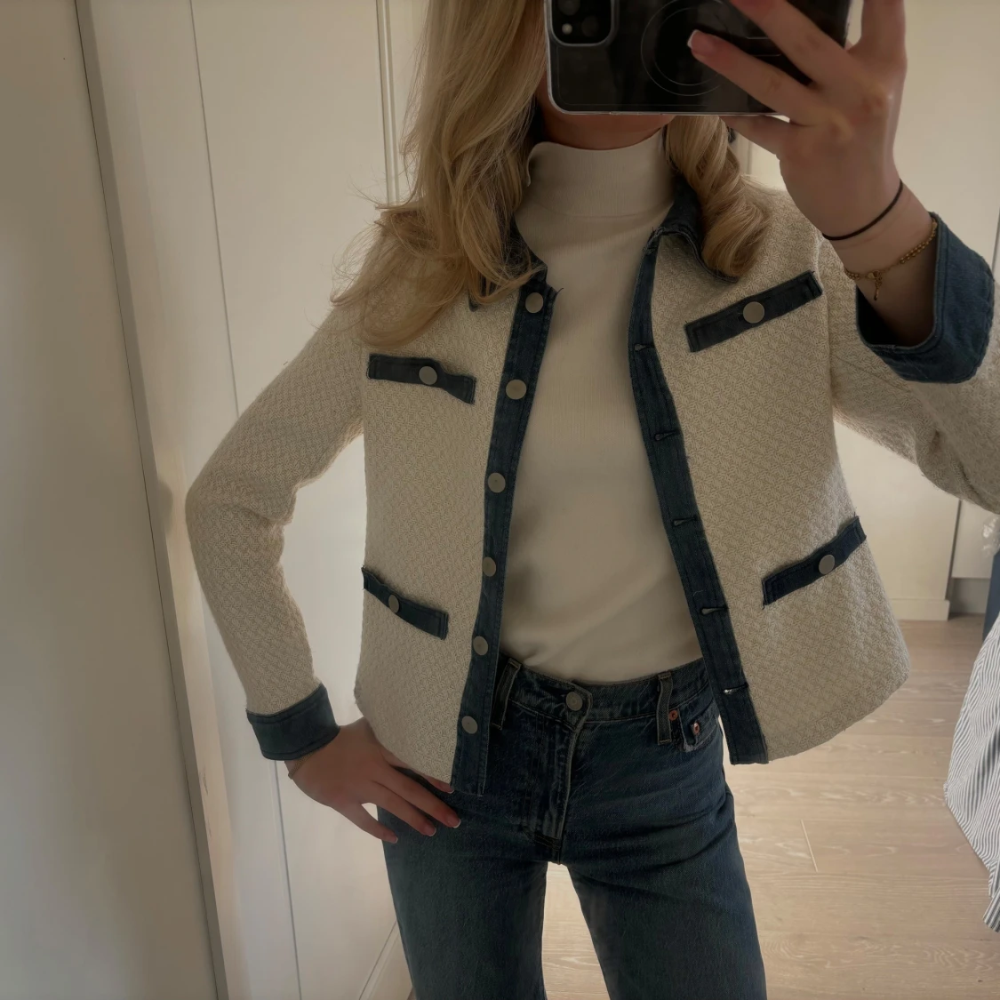 Sjukt fin kavaj med denimdetaljerđ köpt secondhand och stĂ„r tyvĂ€rr inget mĂ€rke i