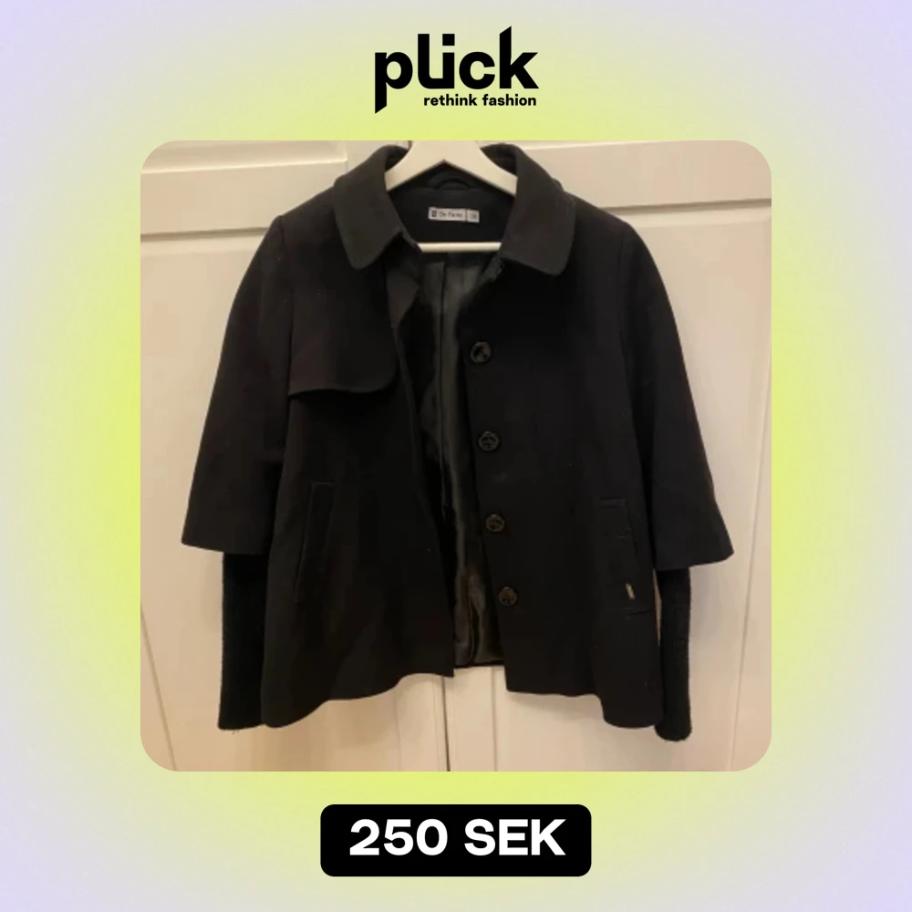 Supersnygg svart, kortärmad kappa med stickade ärmar. Kappan är från De Facto, köpt på Vinted, och är i storlek 36. Säljs pga att den inte kommer till användning🖤