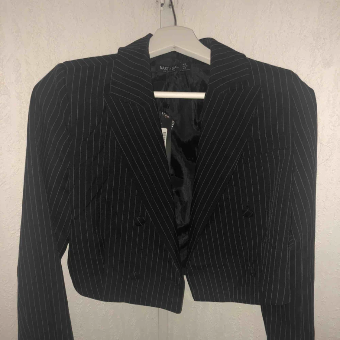 Grå croppad kavaj/bolero med stora knappar - Säljer en grå croppad kavaj/jacka/bolero som har trekvartsärm och en strukturerad krage som ger en unik look.