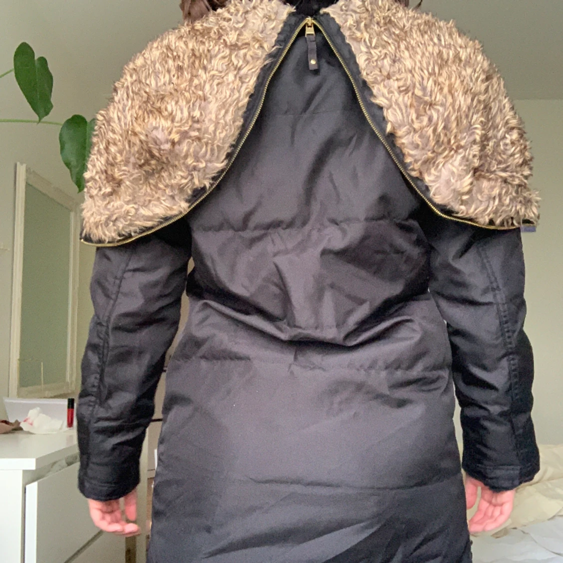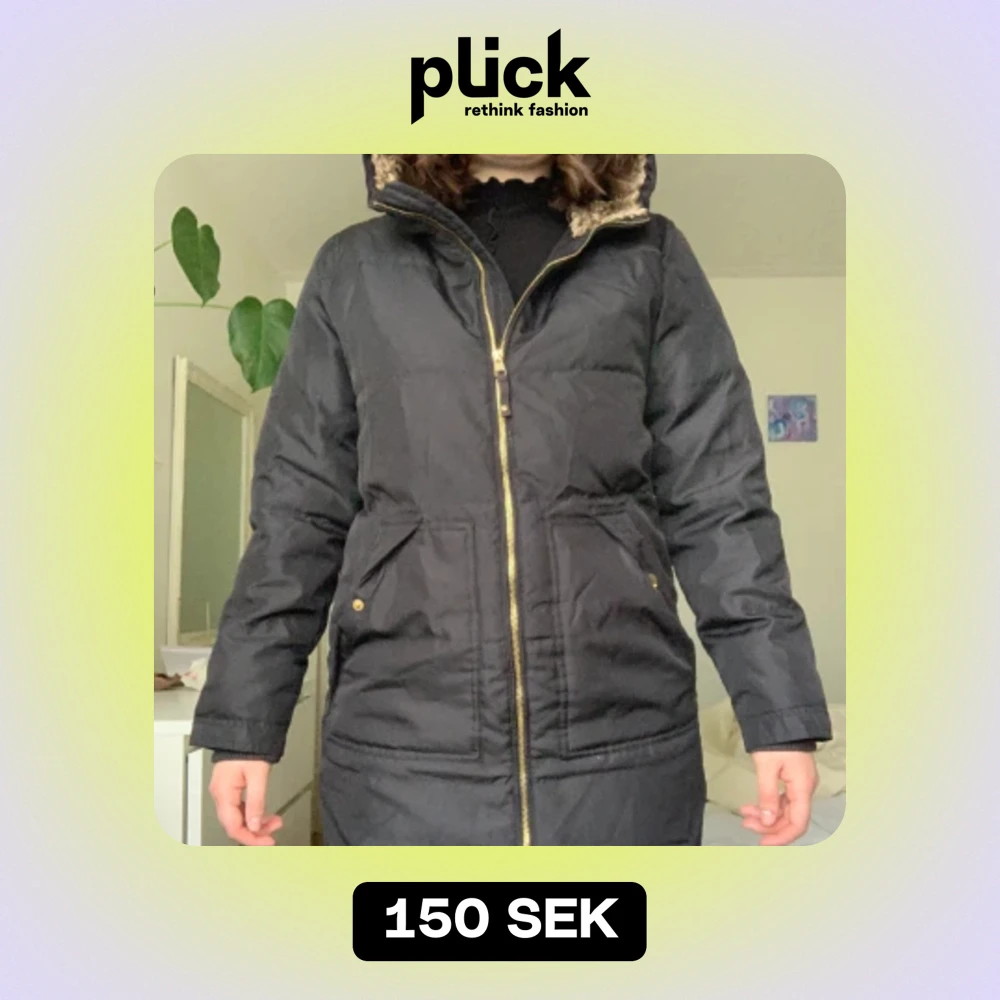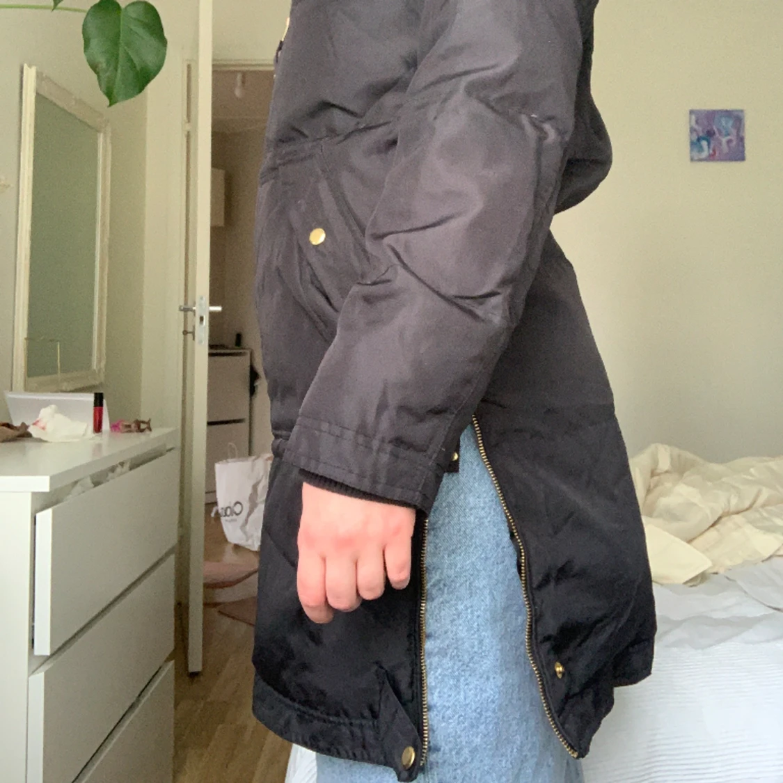 Svart jacka med fakepäls i luvan. Dragkedja fram, sidan och i luvan. Fungerande fickor. Den är ganska tunn men den passar till höst. Bra skick. S/M