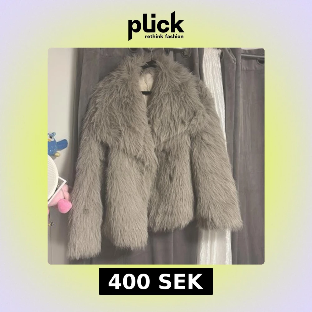 Säljer en supermjuk och fluffig grå pälsjacka med långa ärmar och bred krage. Jackan har knäppning framtill och fickor. Passar M/L