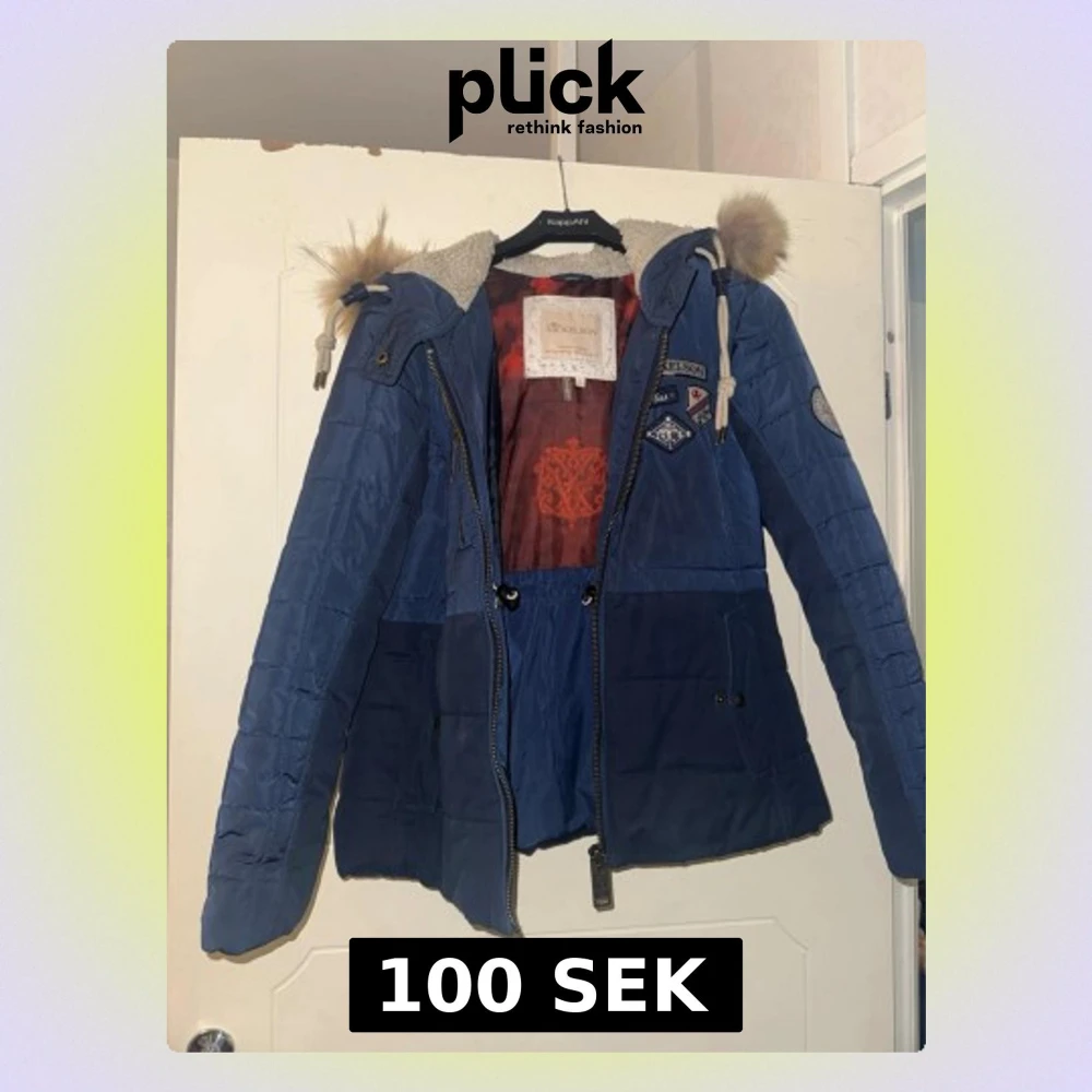 Snygg blå dunjacka från Nickelson med äkta päls på huvan och coola patchdetaljer på bröstet. Jackan har dragkedja, snörning i midjan och mysigt foder. Perfekt för kalla dagar och ger en sportig vibe.