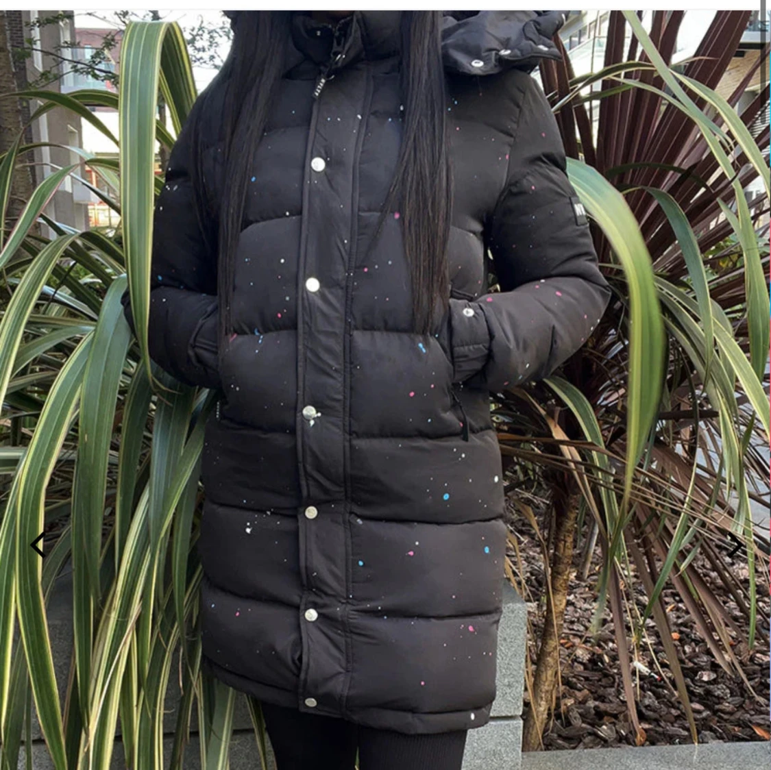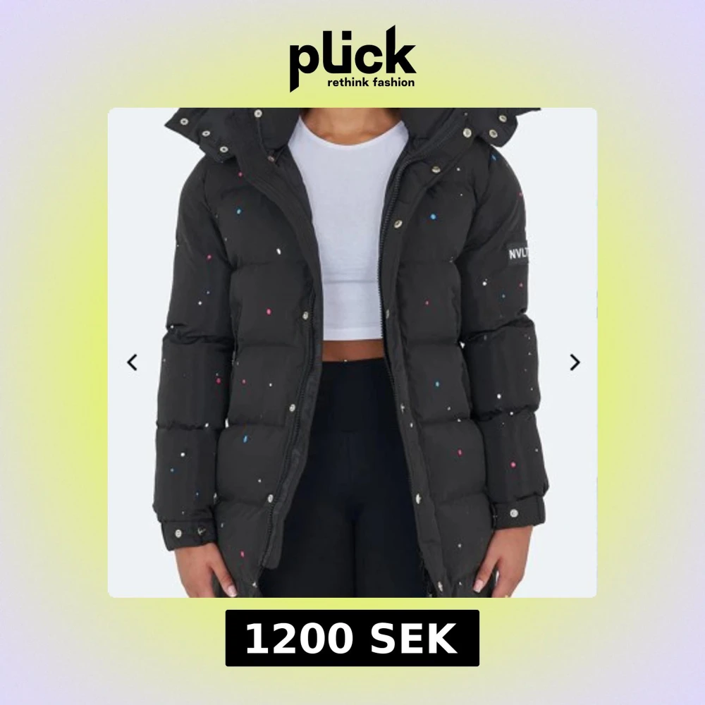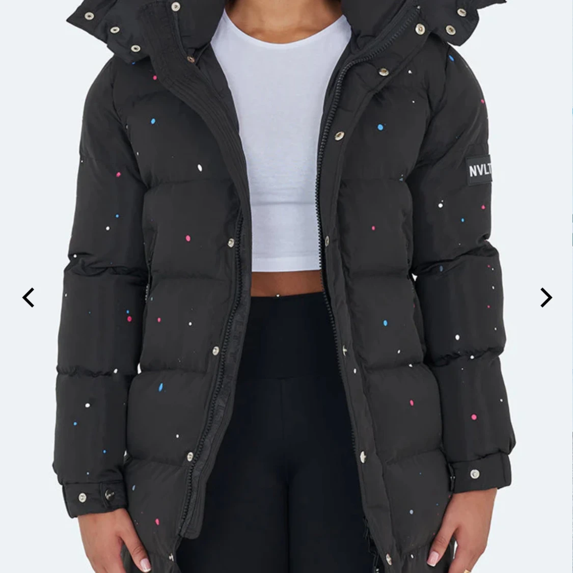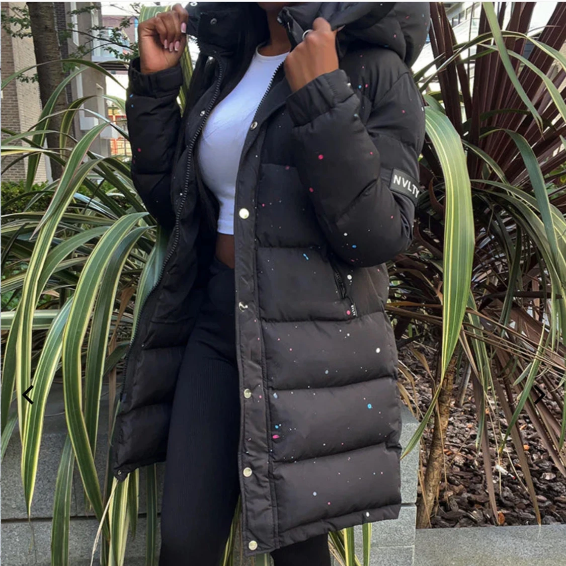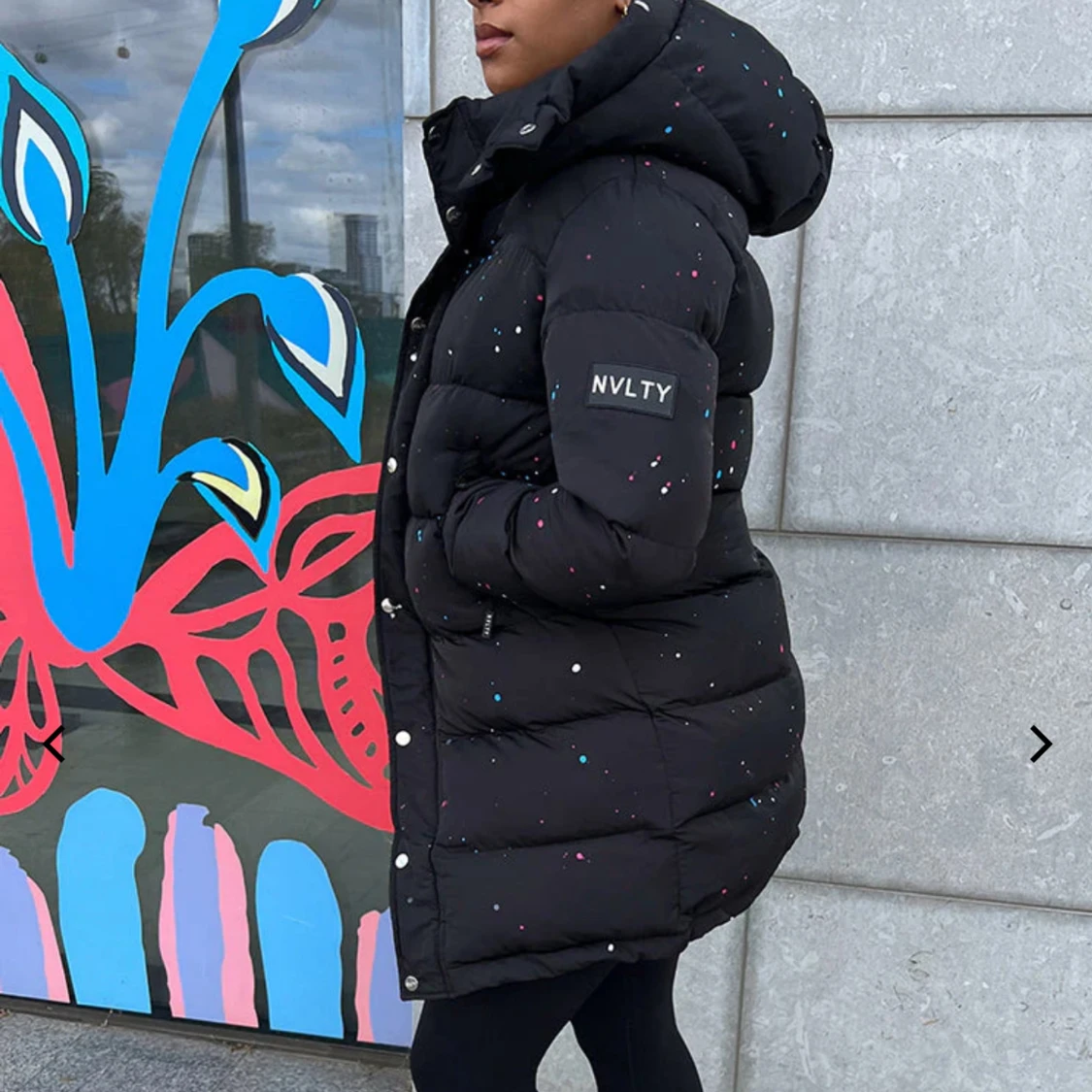 Svart lång pufferjacka från NVLTY med färgglada prickar i blått, rosa och vitt. Jackan har huva, dragkedja och knappar framtill samt elastiska muddar vid ärmslut. Perfekt för kalla dagar och har en cool streetstil-vibe.
