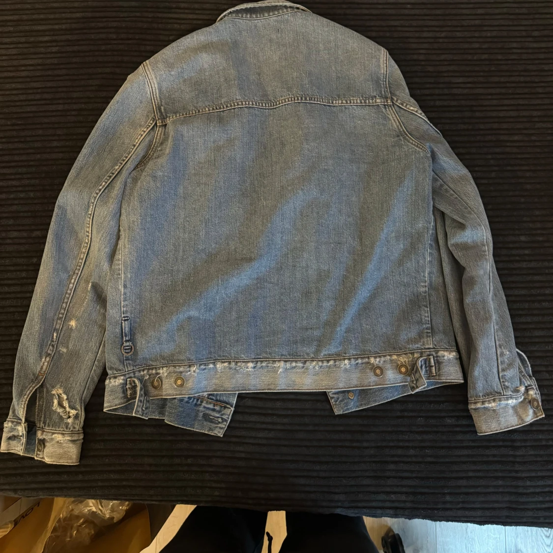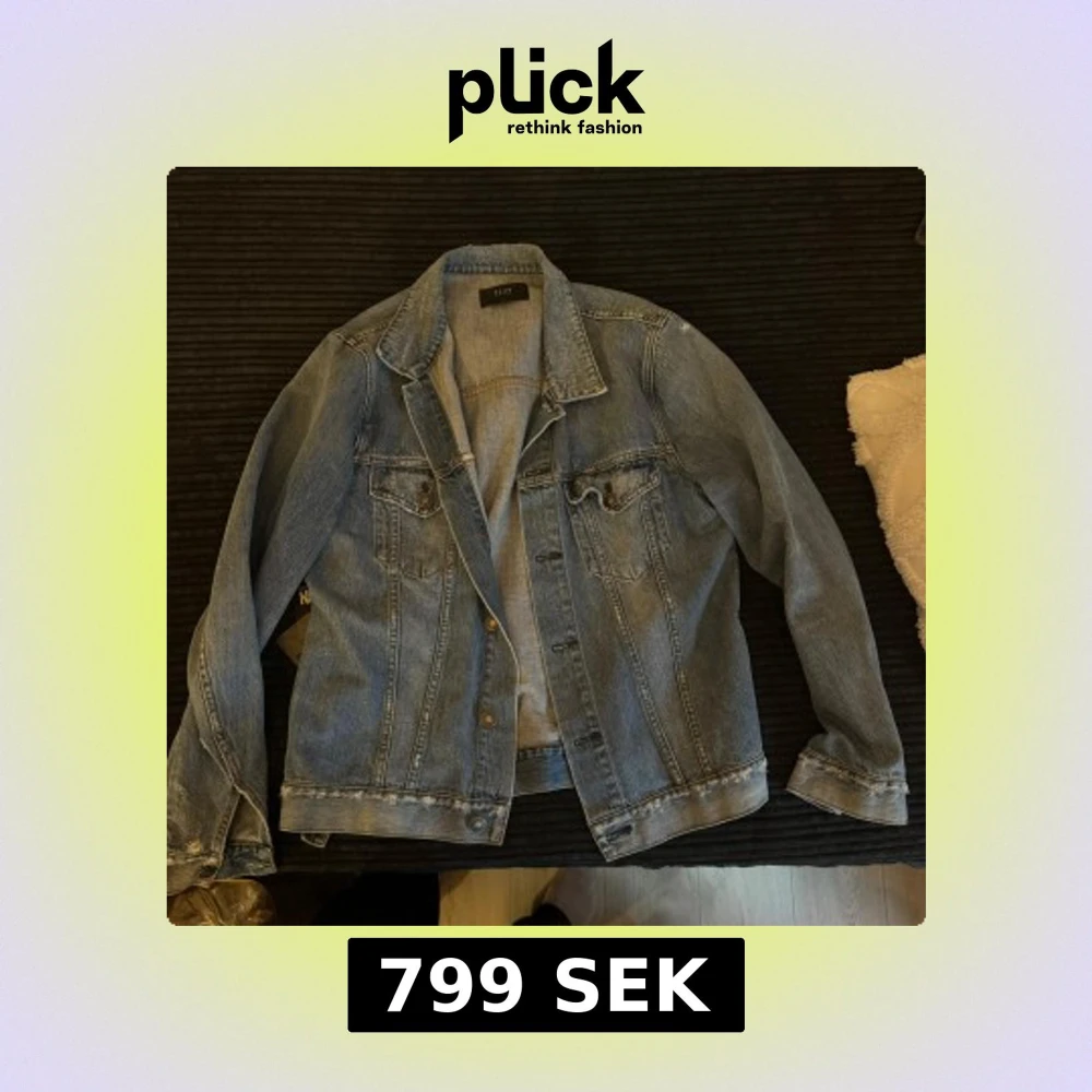 Klassisk blå jeansjacka från Neuw med snygga slitningar och bronsfärgade knappar. Jackan har två bröstfickor med lock och knappar samt justerbara knappar i midjan. Perfekt oversized fit för en avslappnad look. Storlek M-L, känns mer som M.