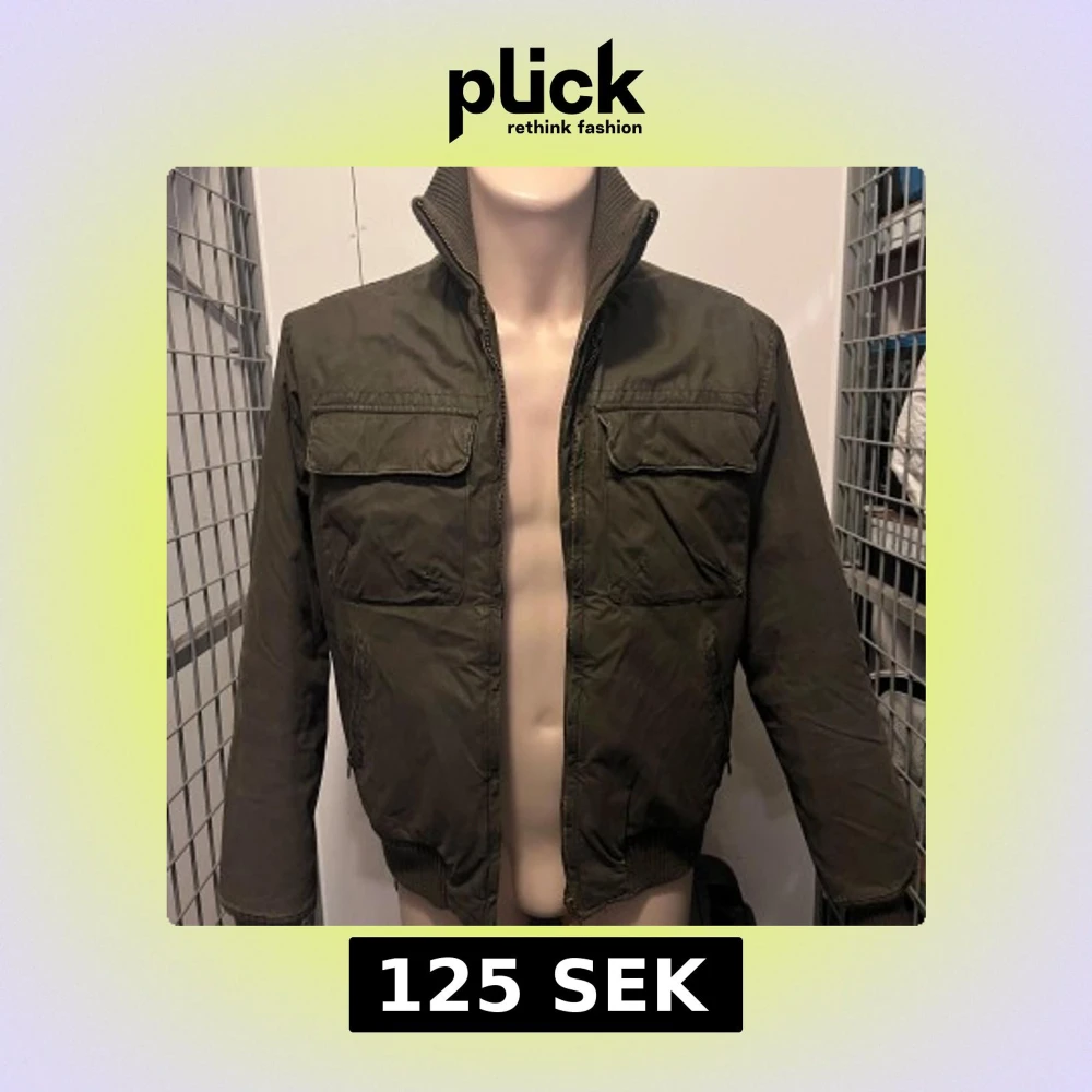 Säljer en olivgrön jacka från H&M L.O.G.G. med dragkedja och ribbad krage. Jackan har två bröstfickor med lock och är quiltad på insidan för extra värme. Perfekt för kyligare dagar!