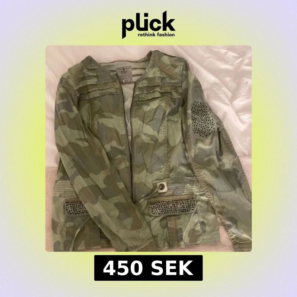 Snygg camouflagejacka från Pulz Jeans med dragkedja framtill och coola svarta nitar på båda ärmarna och fickorna. Jackan har militärgrön bas, raka linjer och detaljer 💗 storlek L men sitter bra på mig som är 170!
