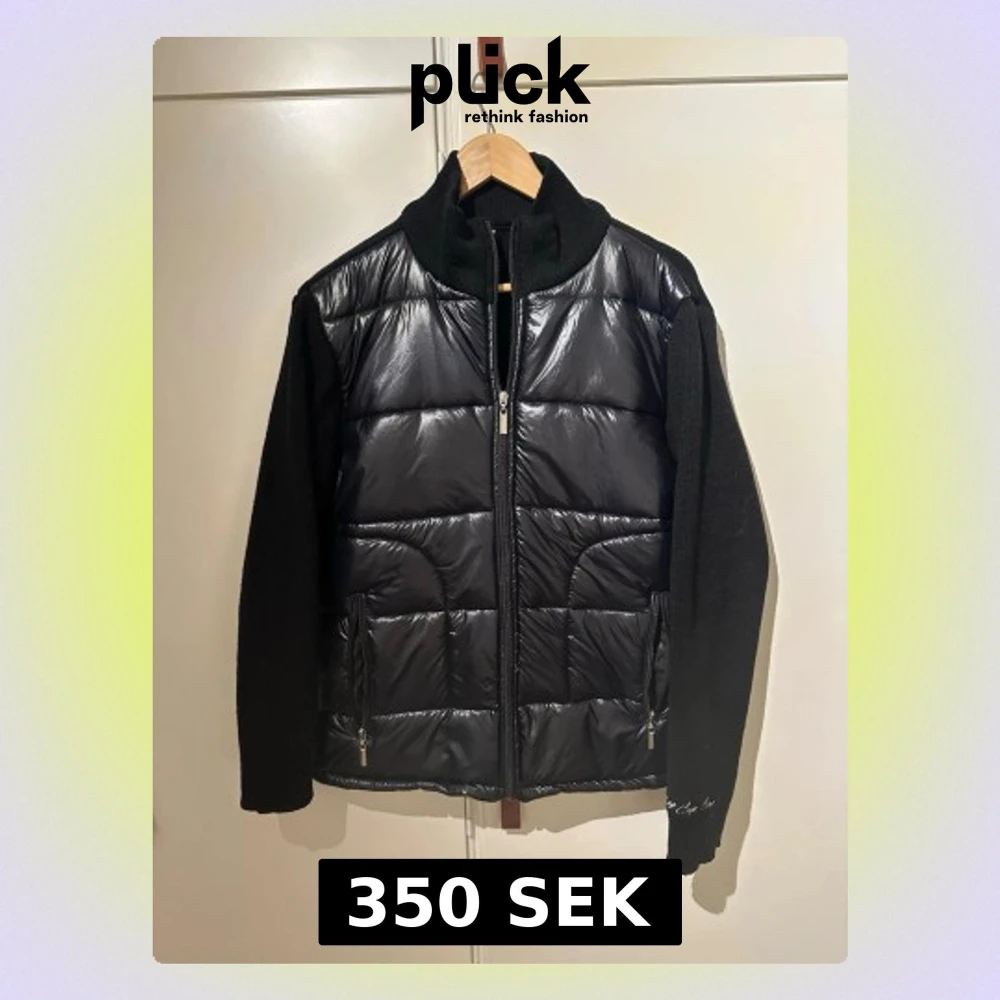 Snygg svart cardiganjacka med glansig, quiltad framsida och stickade ärmar samt rygg. Jackan har hög krage och dragkedja framtill, samt två fickor med dragkedja. Perfekt för dig som vill ha en modern och mysig look. Helt ny.