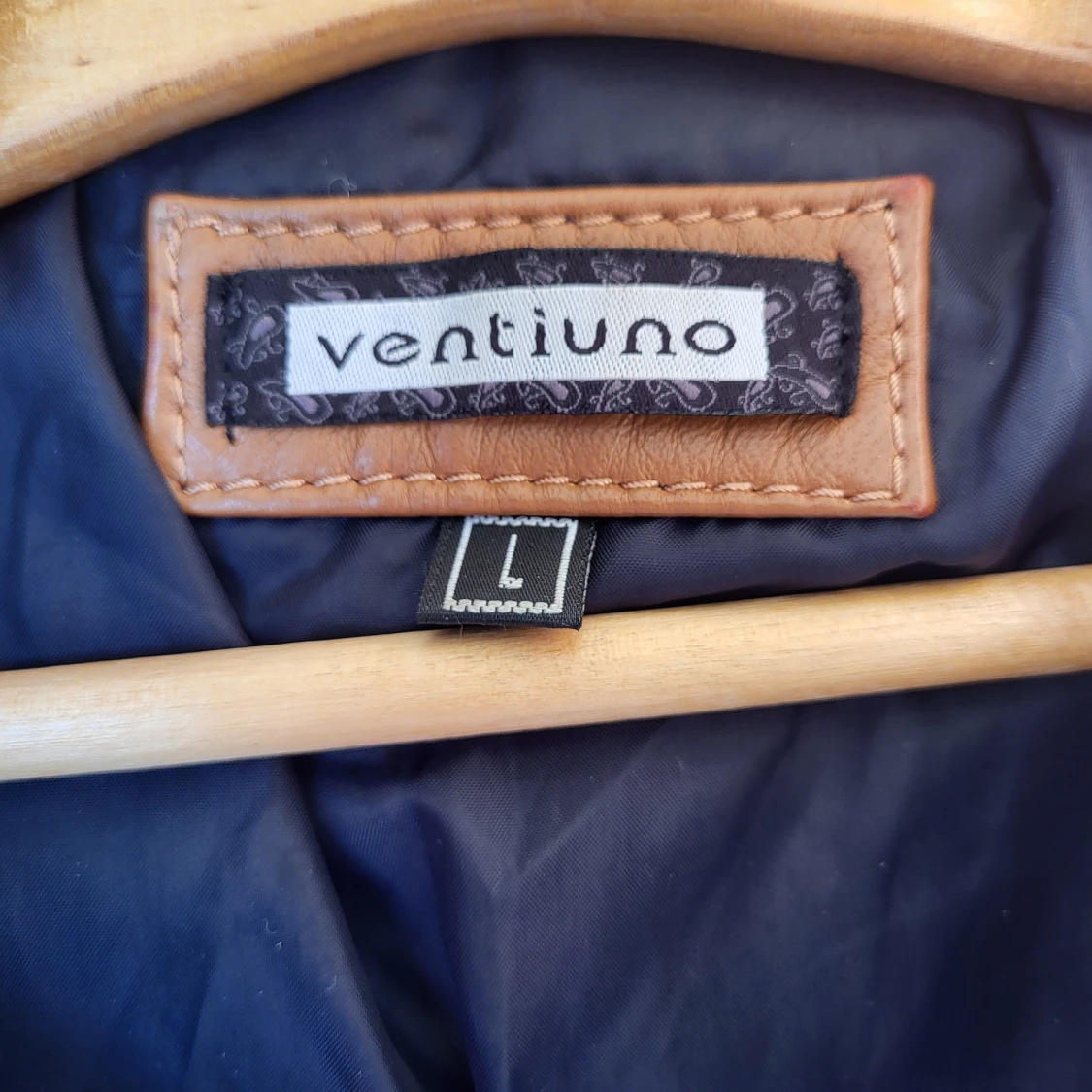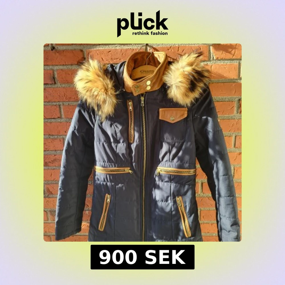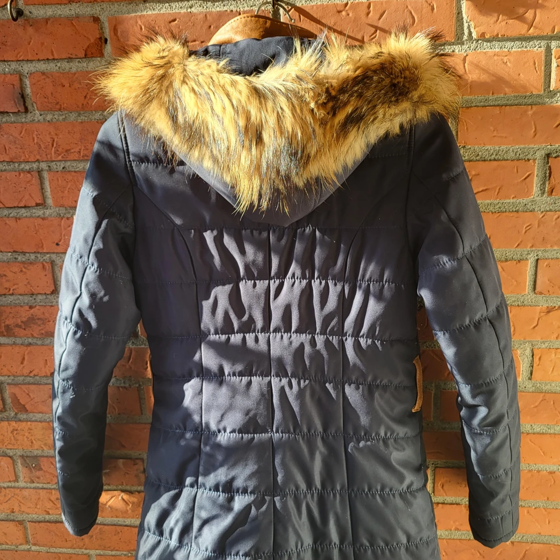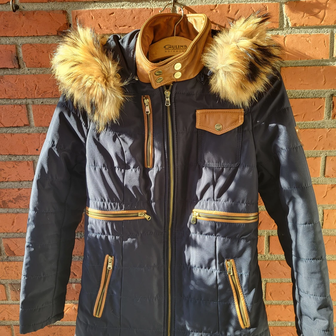 Snygg mörkblå pufferjacka från Ventiuno med bruna detaljer i skinnimitation, guldfärgade knappar och dragkedjor. Jackan har huva med fluffig fuskpäls, flera fickor med dragkedja och hög krage. Perfekt för kalla dagar och riktigt stilren look.