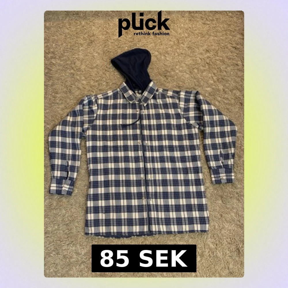 Säljer en blå och vit rutig overshirt från Wilderness i storlek L. Jackan har en mörkblå huva med snörning, knappar hela vägen och långa ärmar med manschett. Materialet är bomull och polyester, och insidan är quiltad för extra komfort.