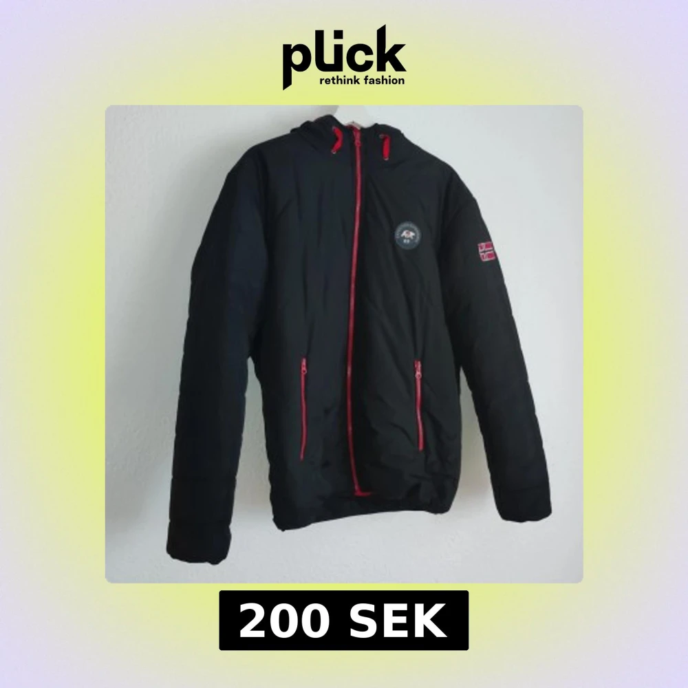 Säljer en svart jacka från Arctic North med röd insida och coola detaljer som en norsk flagga på ärmen. Jackan har en dragkedja i rött och en broderad logga på bröstet. Perfekt för kyliga dagar med sin quiltade design och huva.