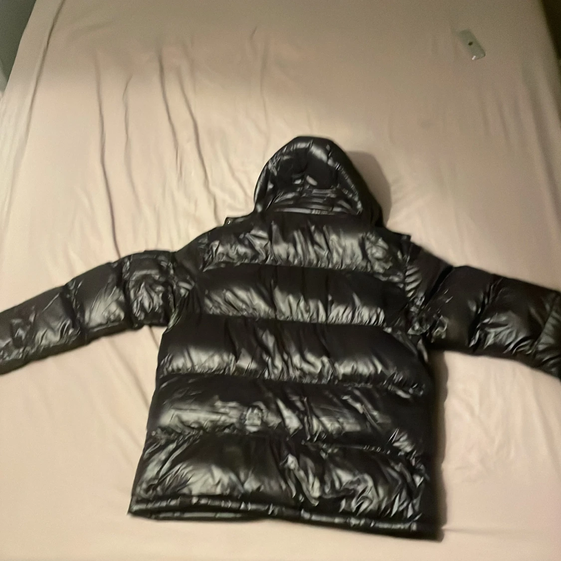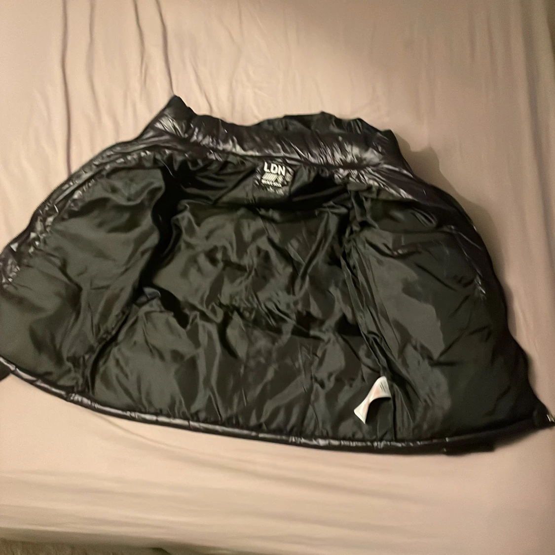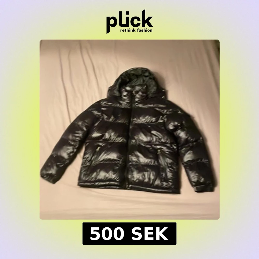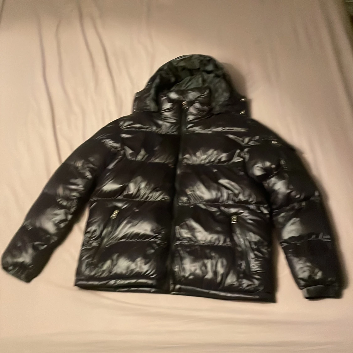 Säljer en svart pufferjacka från LDN med glansig finish och huva. Jackan har dragkedja framtill och två fickor med dragkedja. Perfekt för kalla dagar och riktigt skön att bära. Klassisk pufferstil med breda kanaler och lång ärm.
