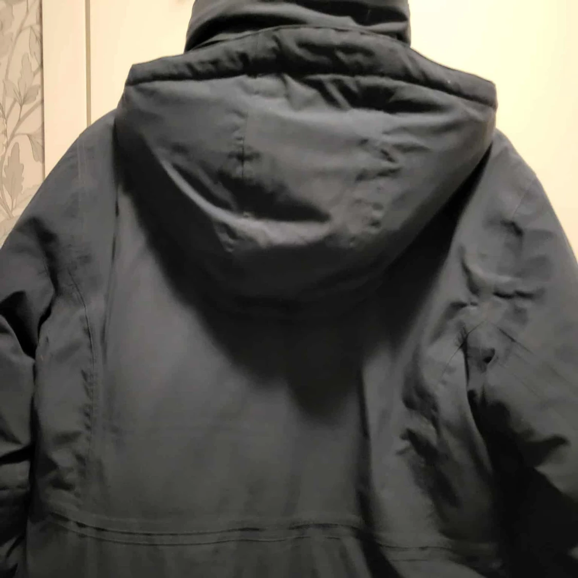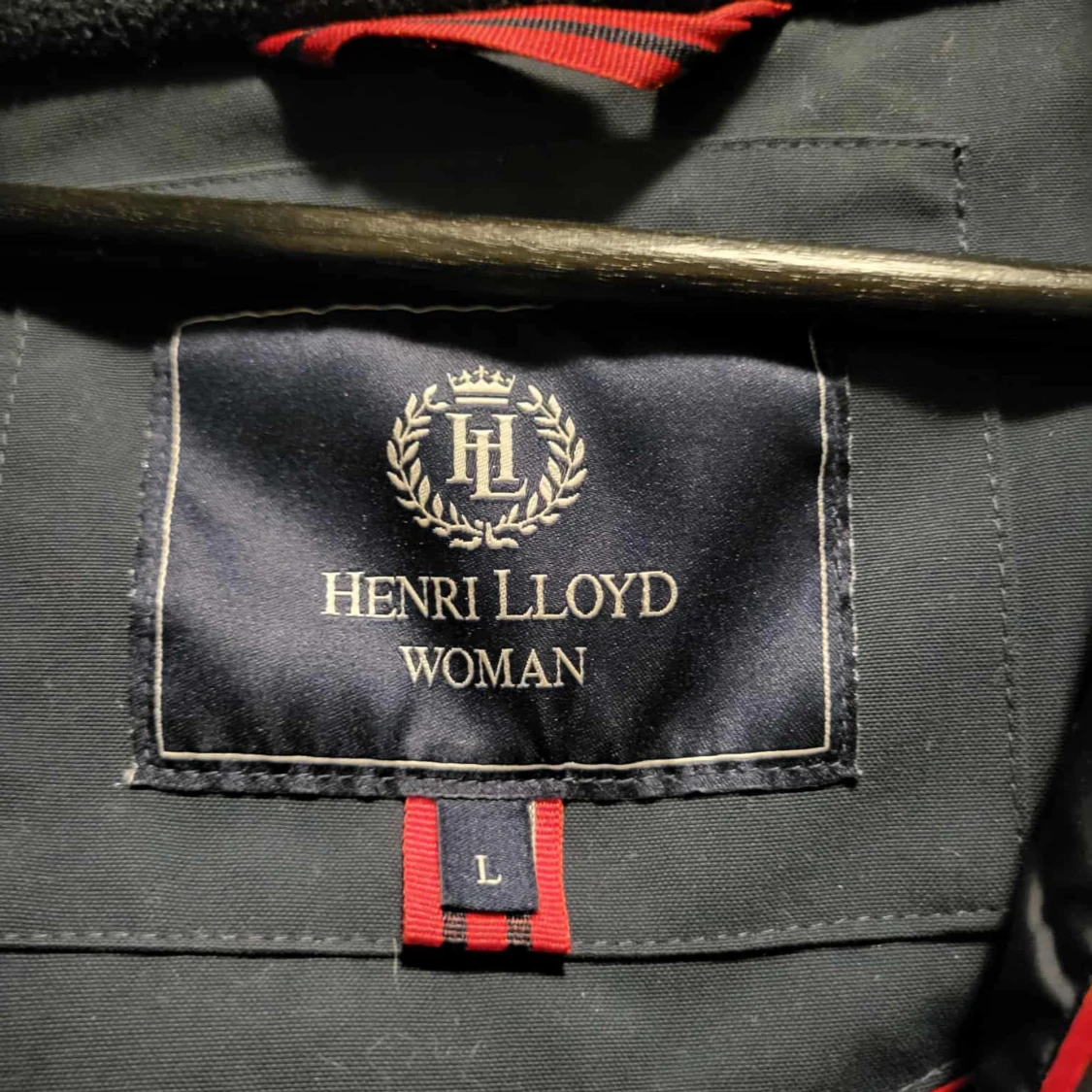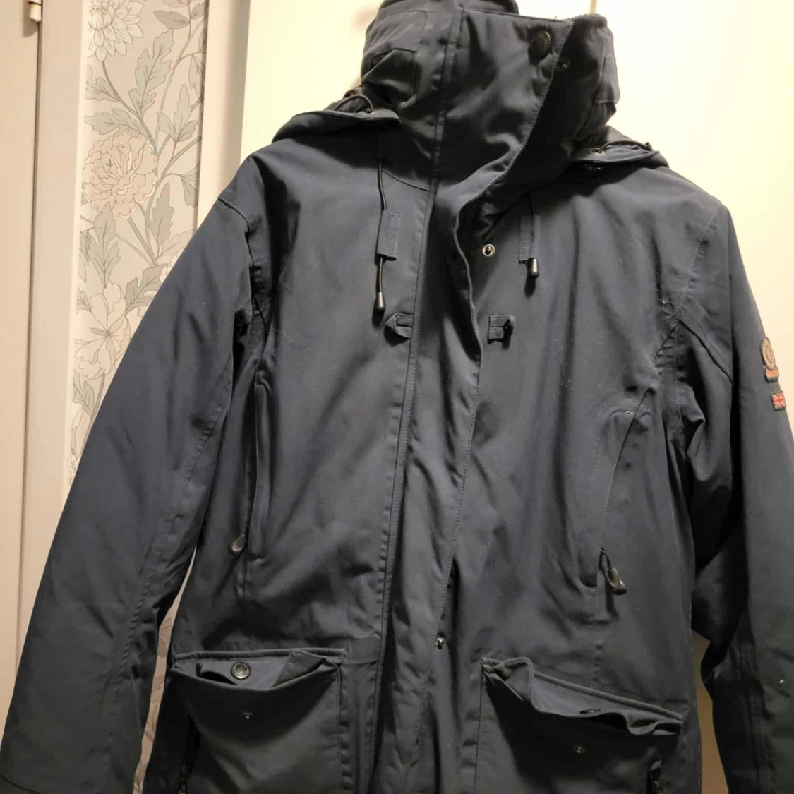 Vinterjacka från Henri Lloyd i mörkblå färg, storlek L. Jackan har huva, snörning vid halsen, flera fickor med både dragkedja och knappar. Använd två gånger.