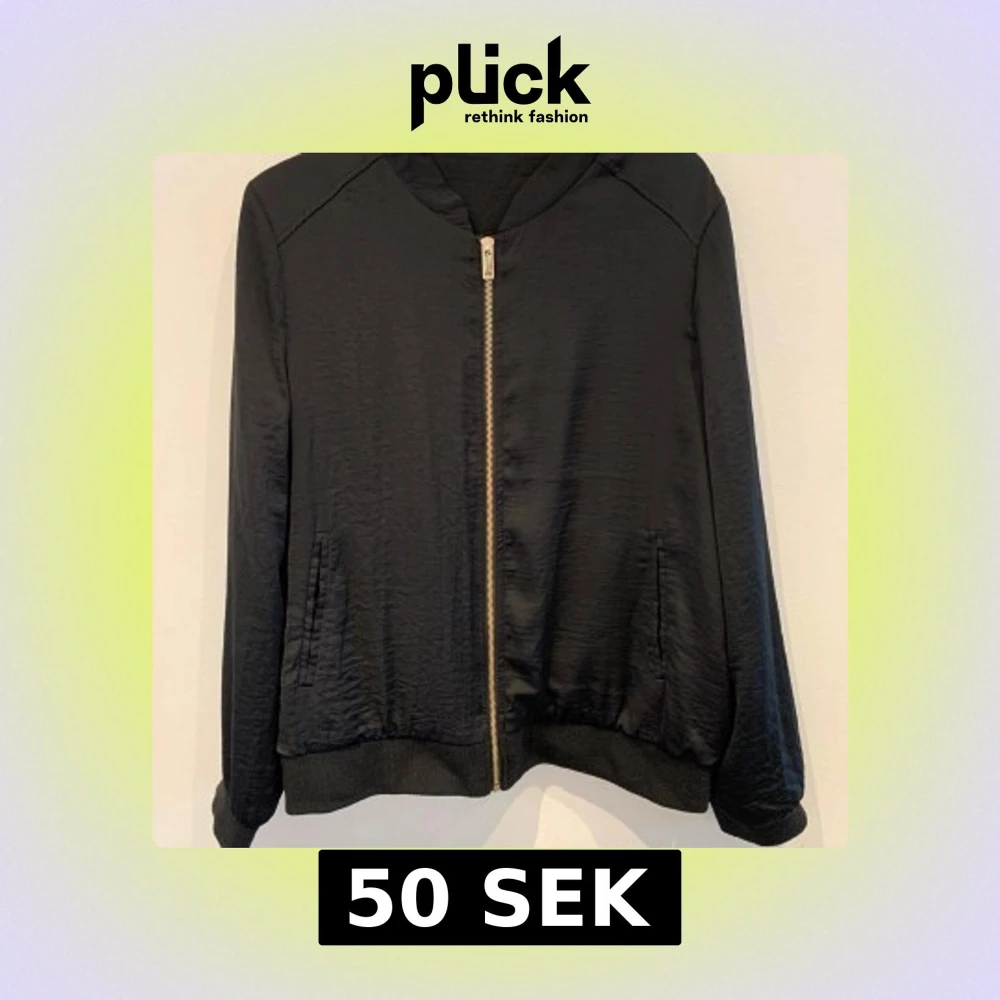 Säljer en stilren svart bomberjacka med silkeslen yta och dragkedja framtill. Jackan har långa ärmar, ribbade muddar och två fickor på sidorna. Perfekt för dig som vill ha en enkel men snygg jacka till vardags.