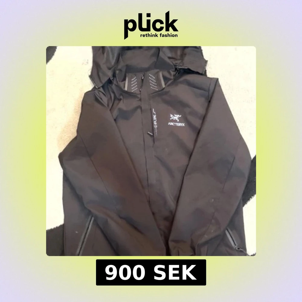 Säljer en svart vindjacka från Arc'teryx med huva och dragkedja. Jackan har en stilren design med logotyp på bröstet och justerbara ärmslut. Perfekt för utomhusaktiviteter.