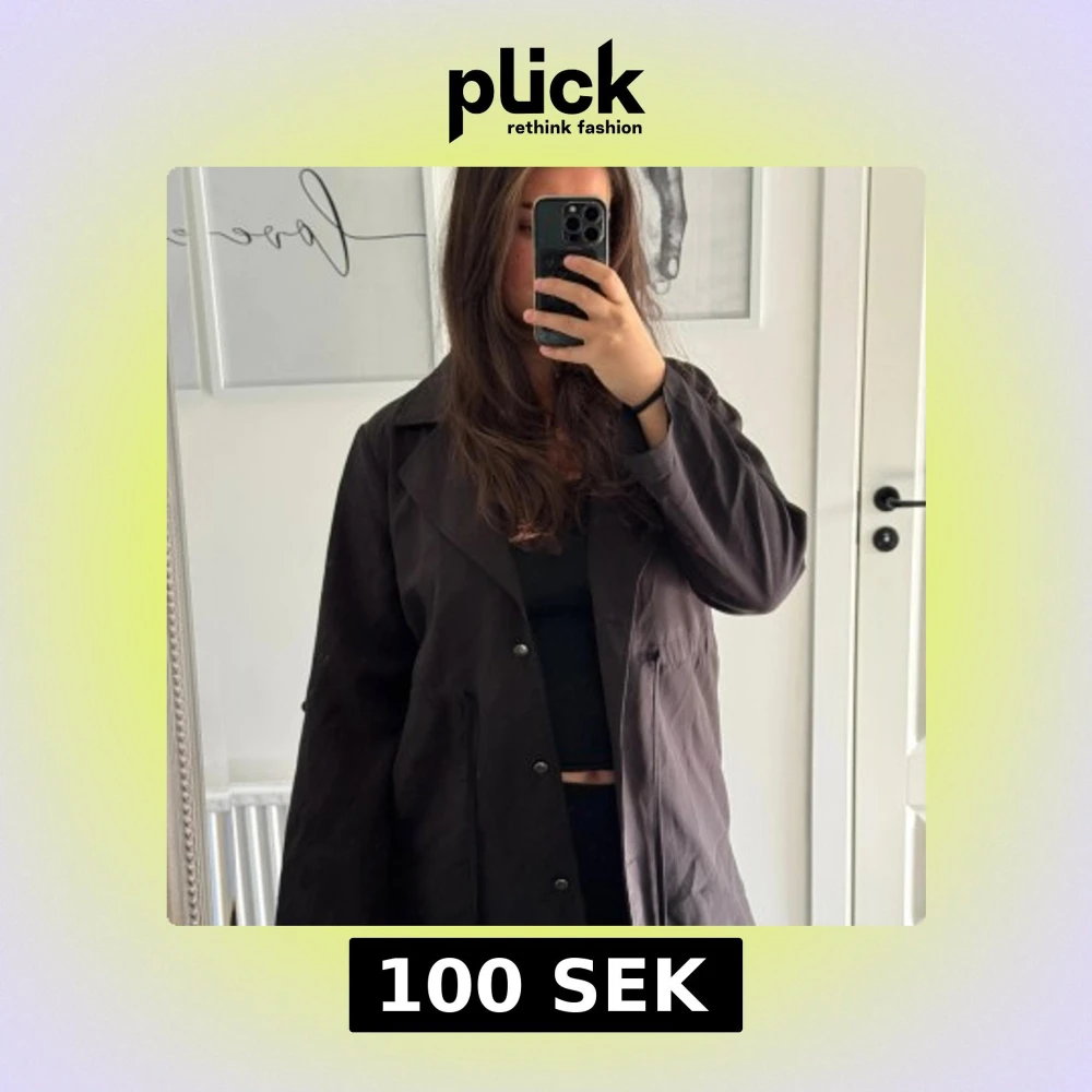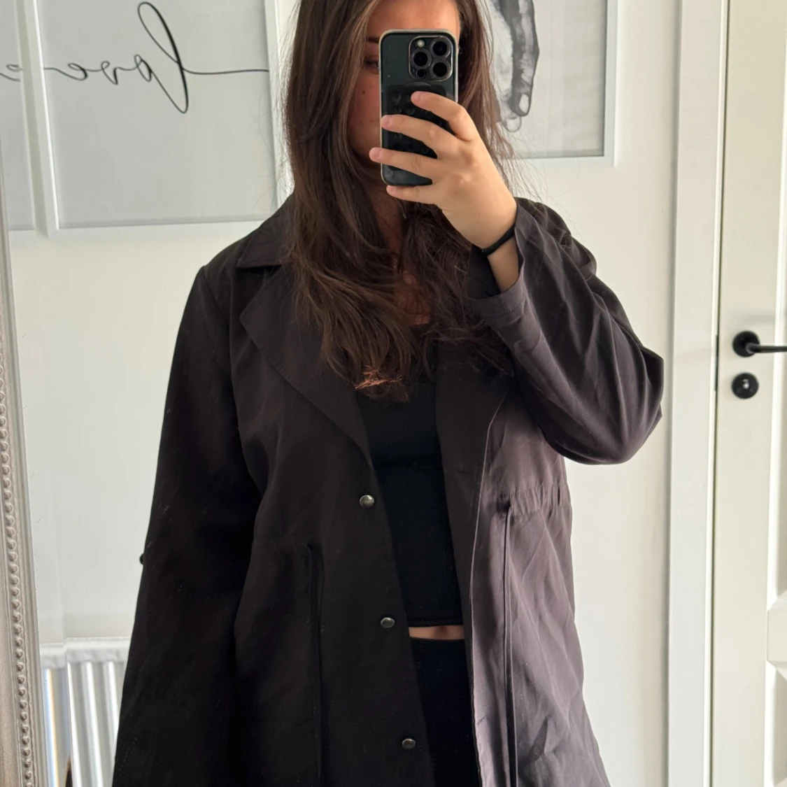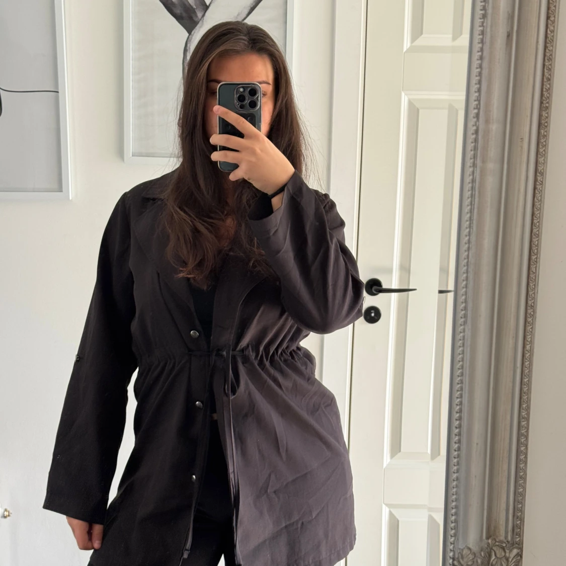 Svart parkajacka med långa ärmar, knappar framtill och snörning i midjan för en snygg passform. Jackan har klassisk krage och är tillverkad i ett mjukt tyg som känns bekvämt. Perfekt för dig som gillar en stilren och enkel look.
