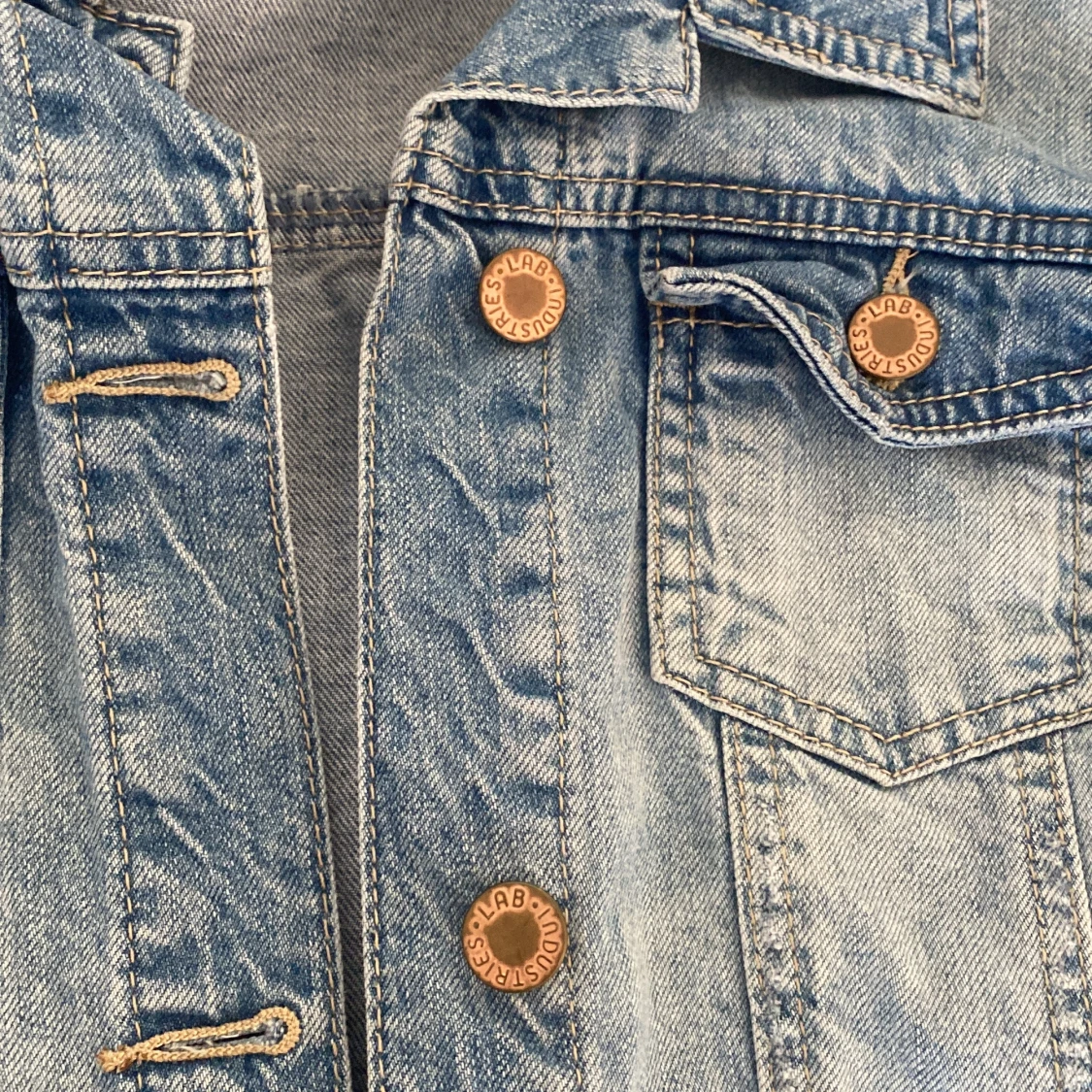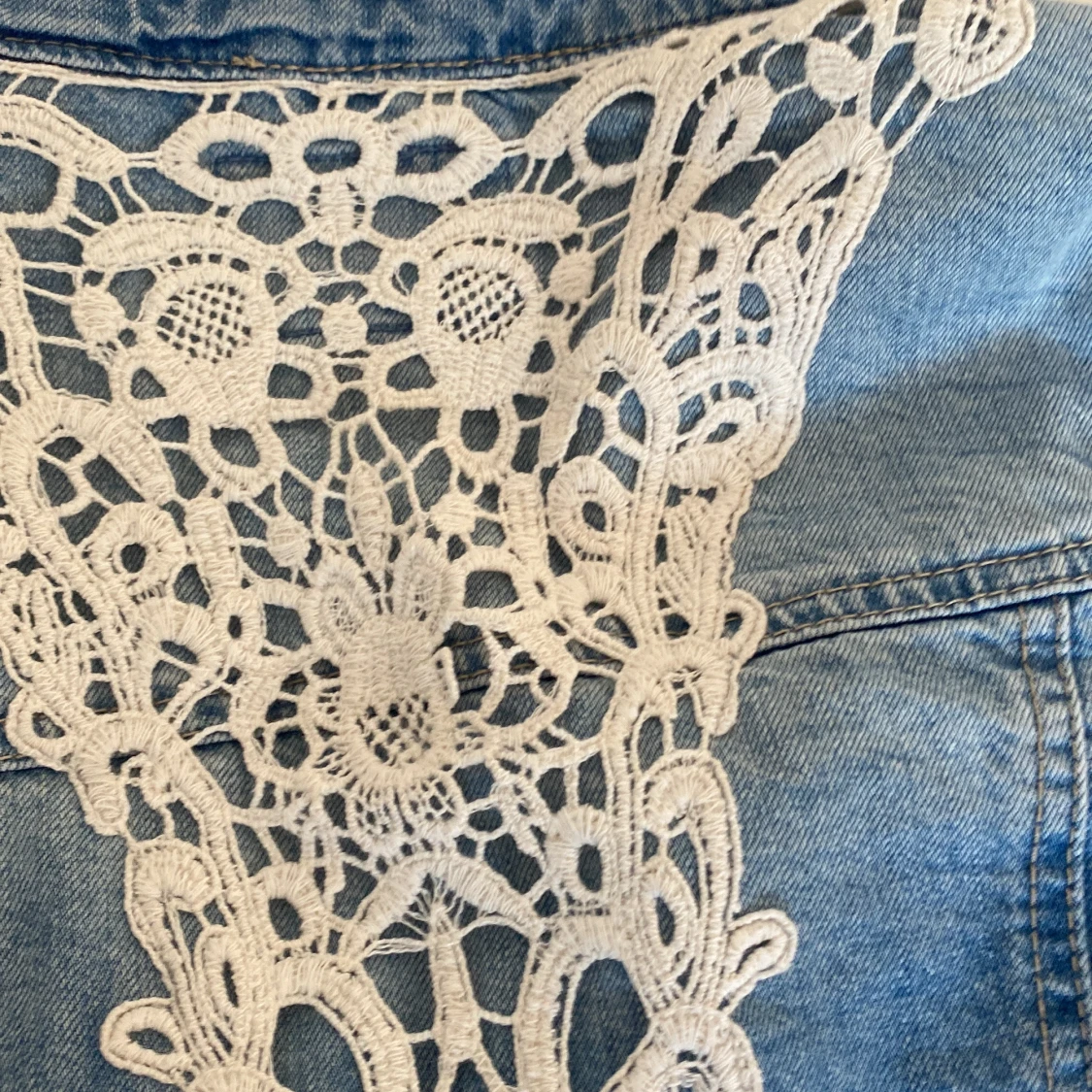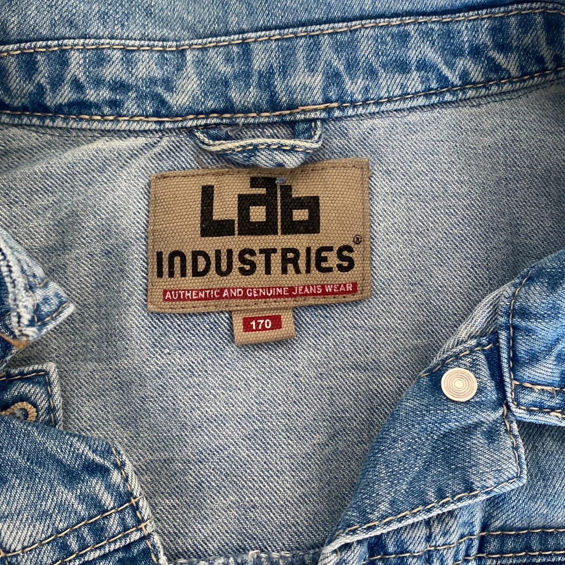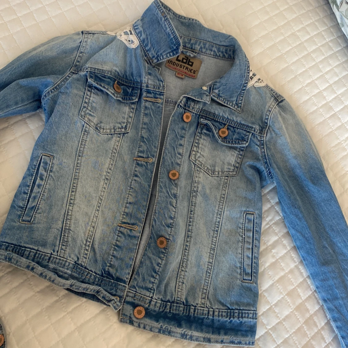 Snygg ljusblå jeansjacka från Lab Industries med coola bronsfärgade knappar och två bröstfickor. Unik spetsdetalj i vitt på axlarna och ryggen som ger jackan en extra touch. Perfekt för dig som vill sticka ut med din stil.