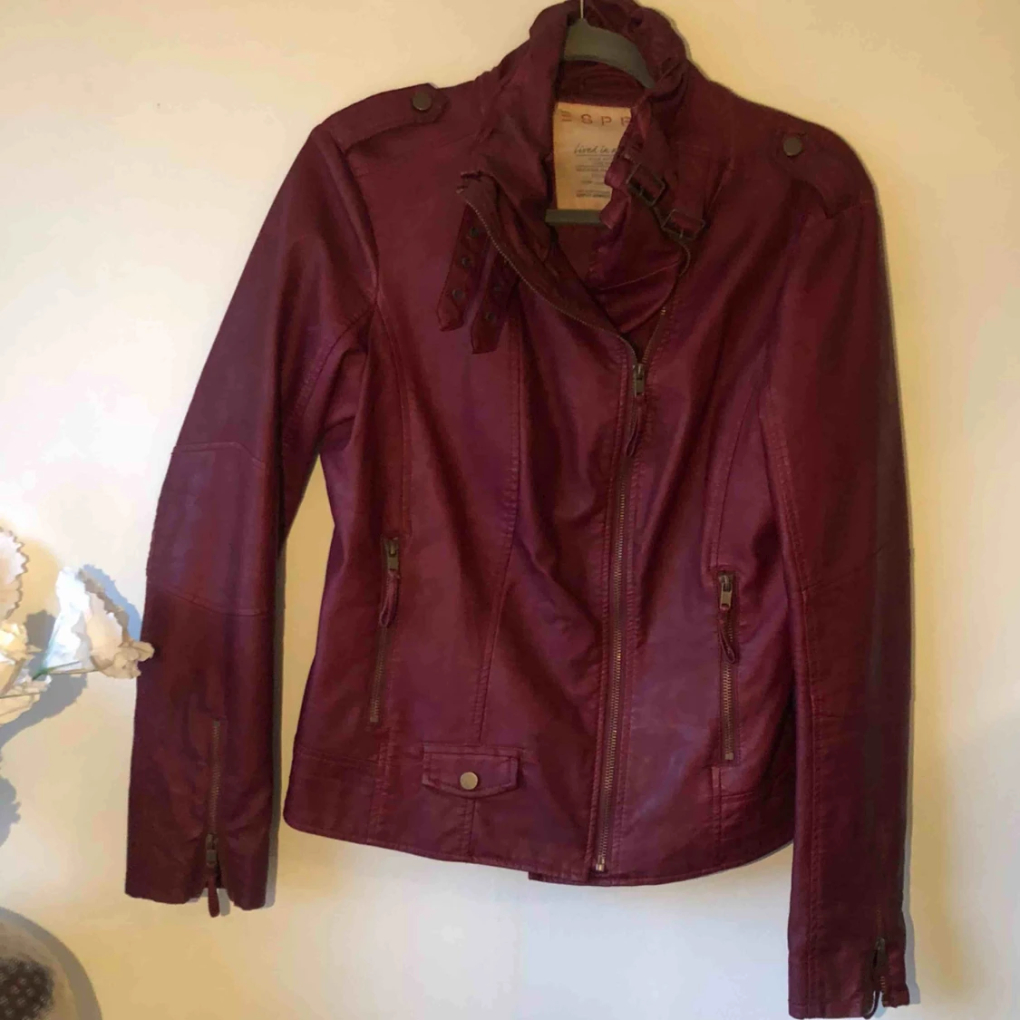 Vinröd MC inspirerad skinnjacka i äkta skin, jackan inte jätte använd och i bra skick.