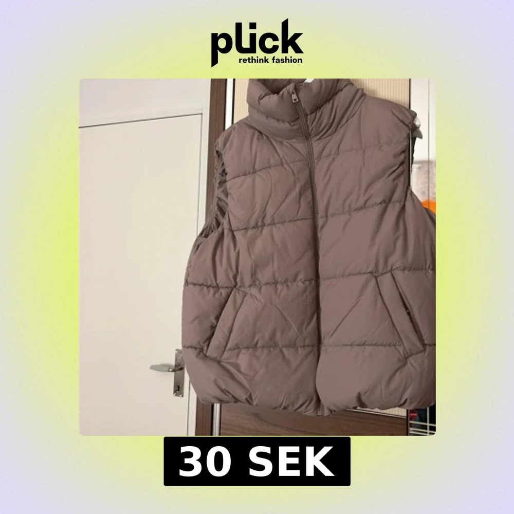Snygg beige dunväst från 157 i storlek M. Västen har hög krage, dragkedja framtill och två praktiska fickor med tryckknapp. Quiltad design ger en cool och puffig look, perfekt att slänga över hoodien när det är kyligt ute.