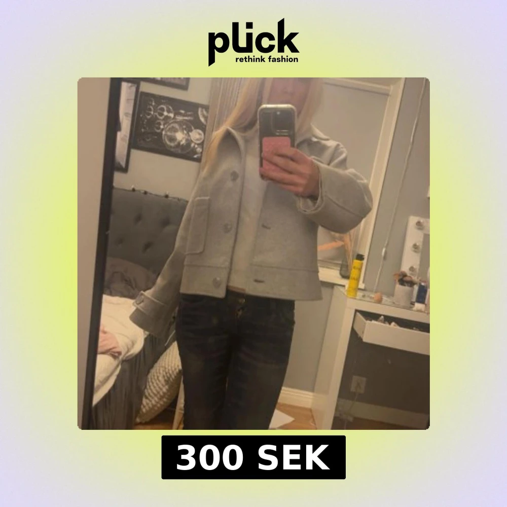 Säljer en stilren grå kappa i kort modell med stora fickor framtill och knappar. Jackan har klassisk krage och långa ärmar med breda muddar. Den ska egentligen ha 2 fickor på båda sidorna men jag har tagit bort en ficka så nu har den ba 1. Tror jackan är i st S