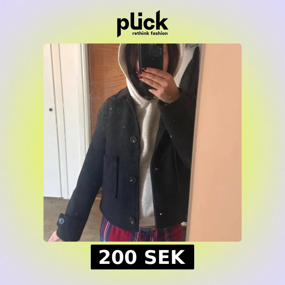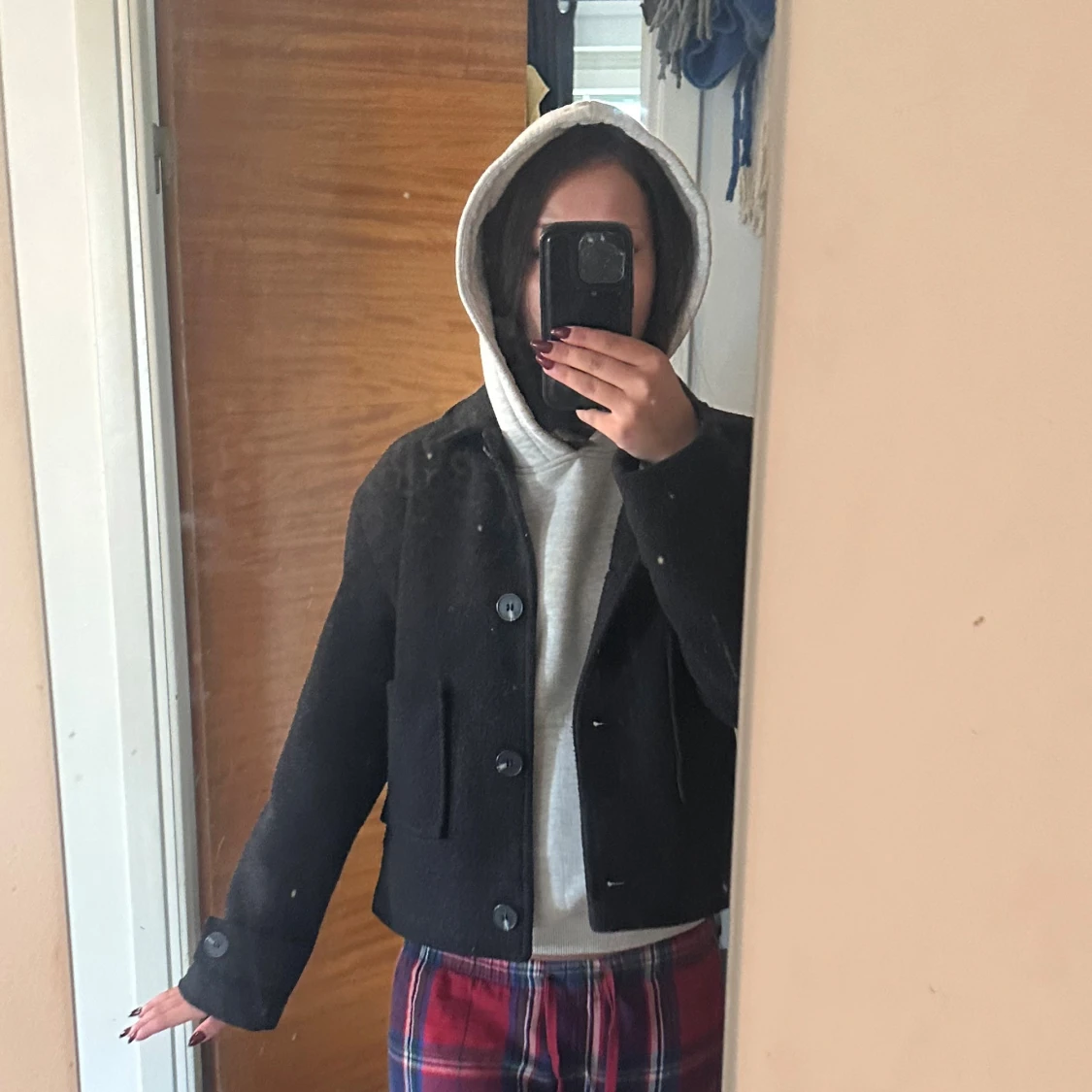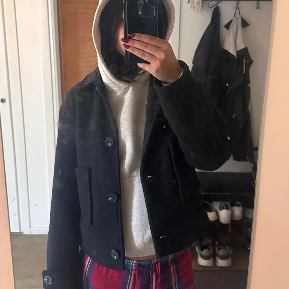 Säljer en svart, kort ulljacka från 157 i storlek XS. Jackan har klassisk krage, stora knappar framtill och två fickor. Perfekt för dig som gillar en clean och stilren look med lite boxig passform.