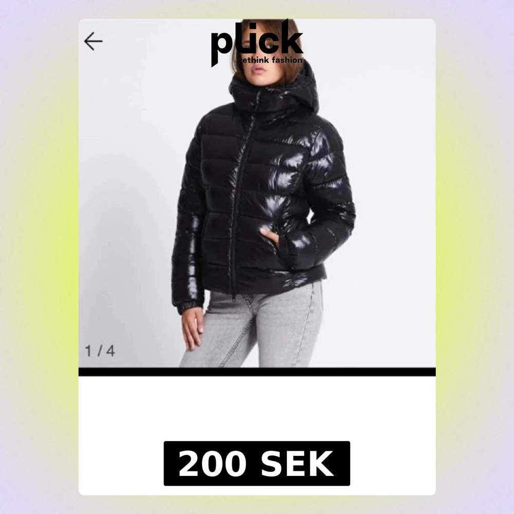Säljer en svart glansig pufferjacka med huva och dragkedja framtill. Jackan har en quiltad look med breda kanaler och elastiska muddar vid ärmsluten. Perfekt för kalla dagar när du vill hålla värmen och ändå se snygg ut.