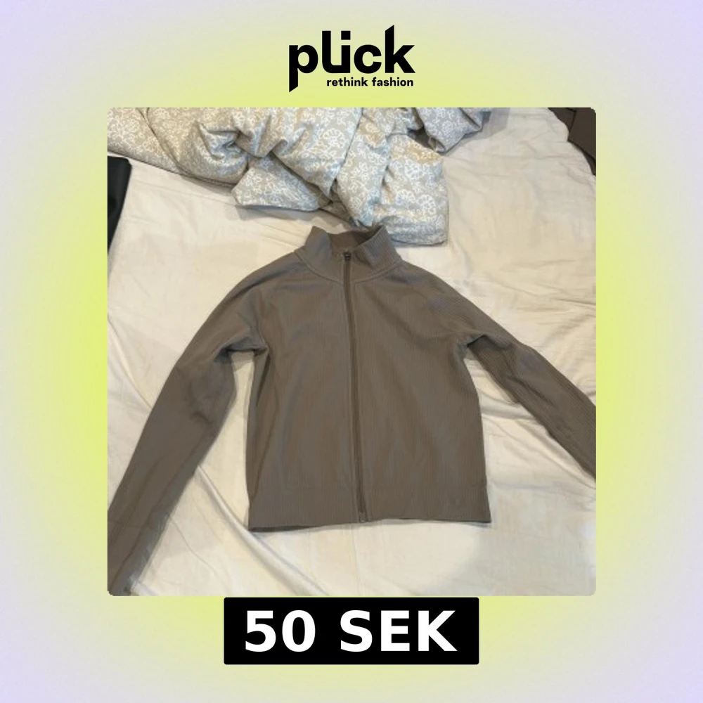 Snygg beige jacka med ribbad struktur och hel dragkedja framtill. Jackan har hög krage och lång ärm, perfekt för lager-på-lager. Enkel och stilren design som passar till det mesta.