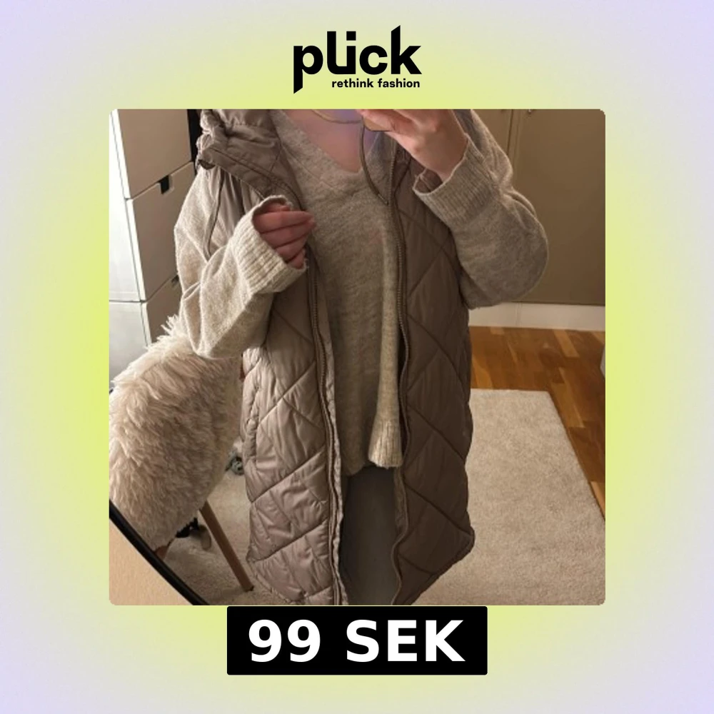 Snygg lång dunväst i beige med quiltat mönster och dragkedja framtill. Västen har en huva med snörning och är perfekt att slänga över en stickad tröja. Stilren och enkel design som passar till många outfits.