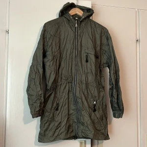 Lätt jacka i 100% polyamid. Går att justera i midjan. Funkar för en S-M-L beroende på hur man vill ha den. Inget märke finns kvar, flera ägare.
