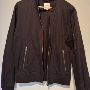 Svart bomberjacka - Svart bomberjacka. Jackan har orange insida, ribbade muddar och dragkedja framtill. Två fickor med tryckknappar.