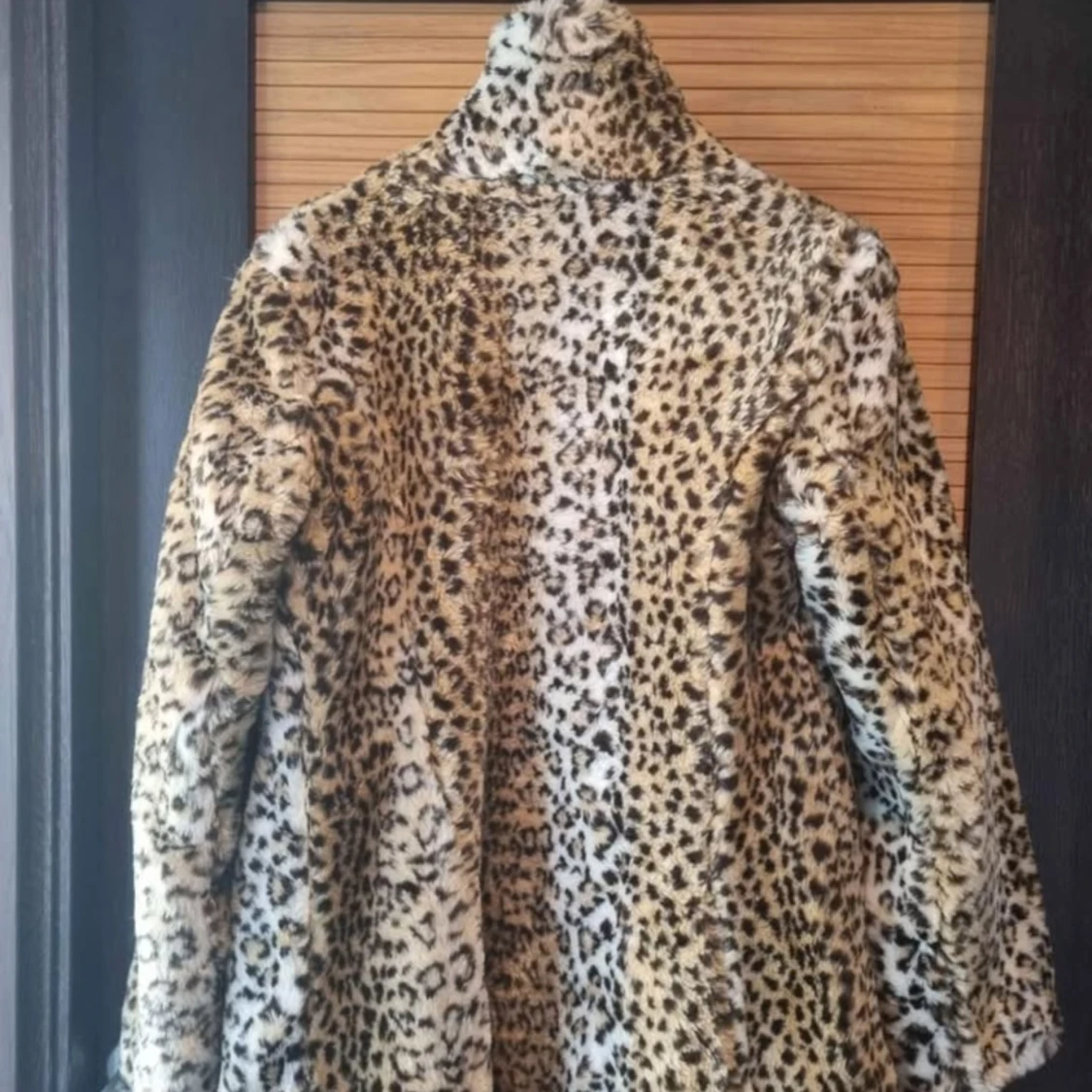 Säljer en leopardmönstrad pälsjacka med långa ärmar. Jackan har en klassisk stil och är perfekt för att sticka ut i mängden. Den är mjuk och bekväm, vilket gör den idealisk för kyligare dagar.