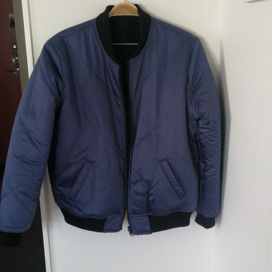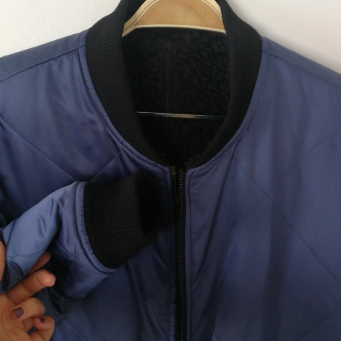 Two sided bomber jacket. Bluesatin and black wool lining. Small size. Sleeves 57cm, body 64 cm long