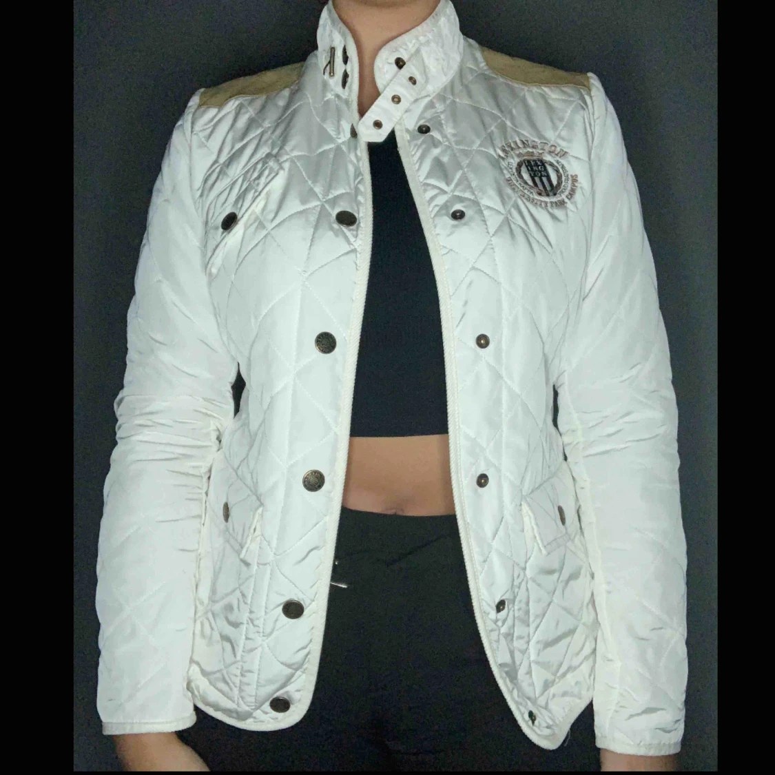 Äkta quiltad lexington jacka med detaljer i mocka, utgången modell. Mycket bra kvalité och kemtvättad efter sista användning så den är som ny