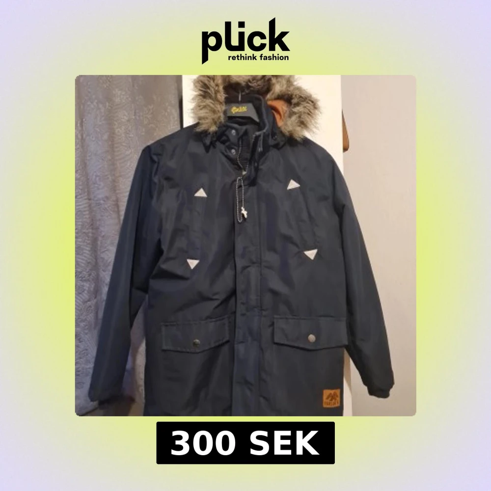 Parkasjacka från Lindex i mörkblått med orangefärgat foder och avtagbar huva med fuskpäls. Jackan har dragkedja, knappar, stora fickor och reflekterande detaljer. Vattenavvisande material, perfekt för kyliga dagar.