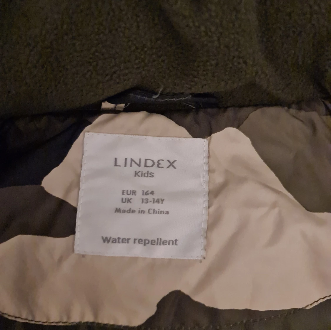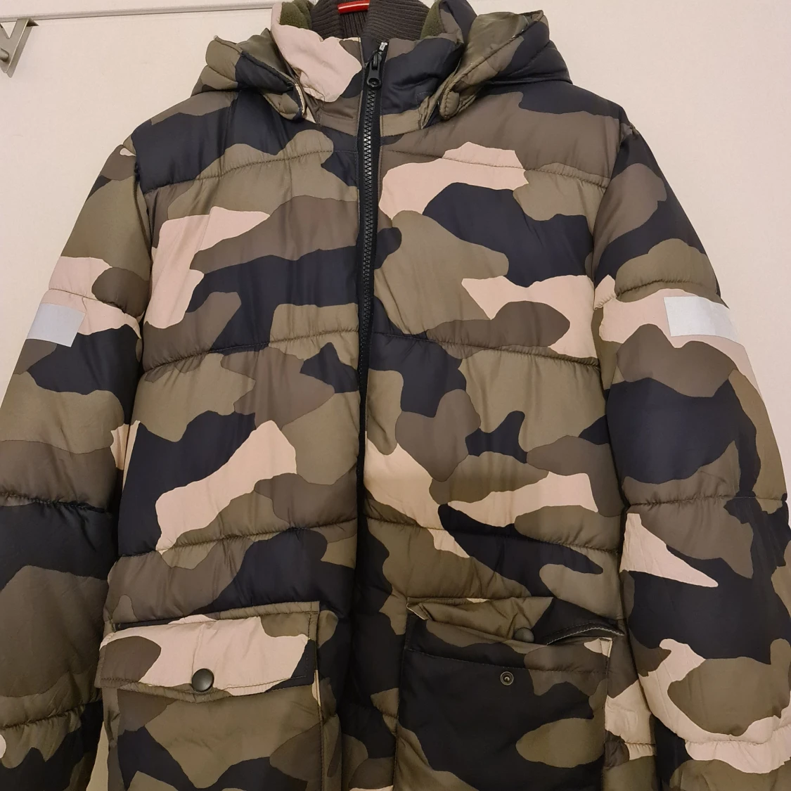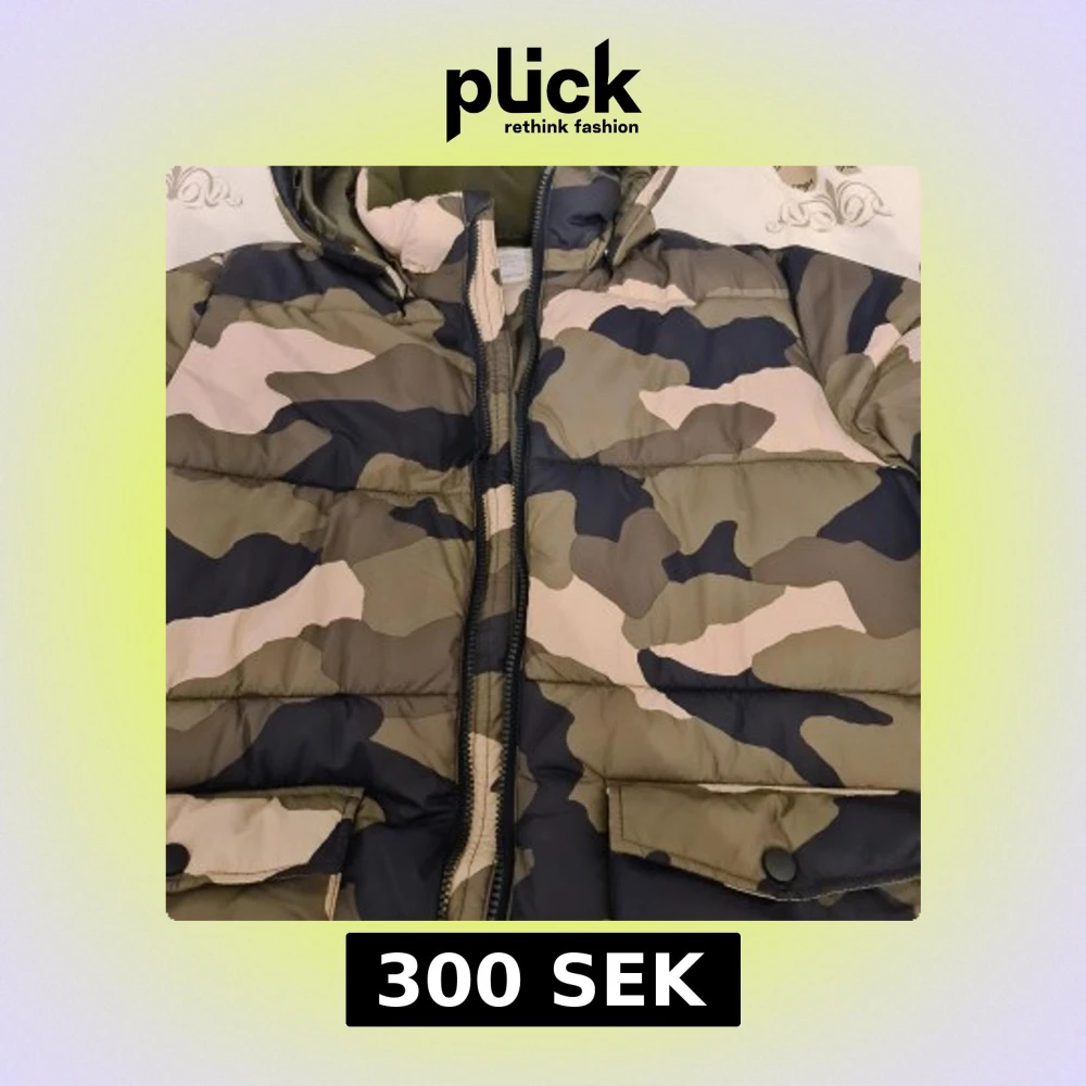 Säljer en vattenavvisande pufferjacka från Lindex i camouflagefärger. Jackan har en huva och dragkedja framtill, samt praktiska fickor med knappar. Perfekt för kyliga dagar.