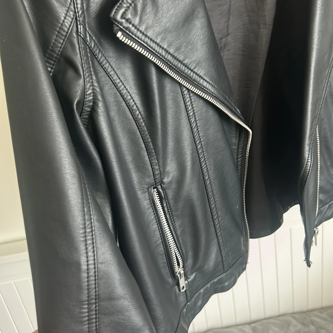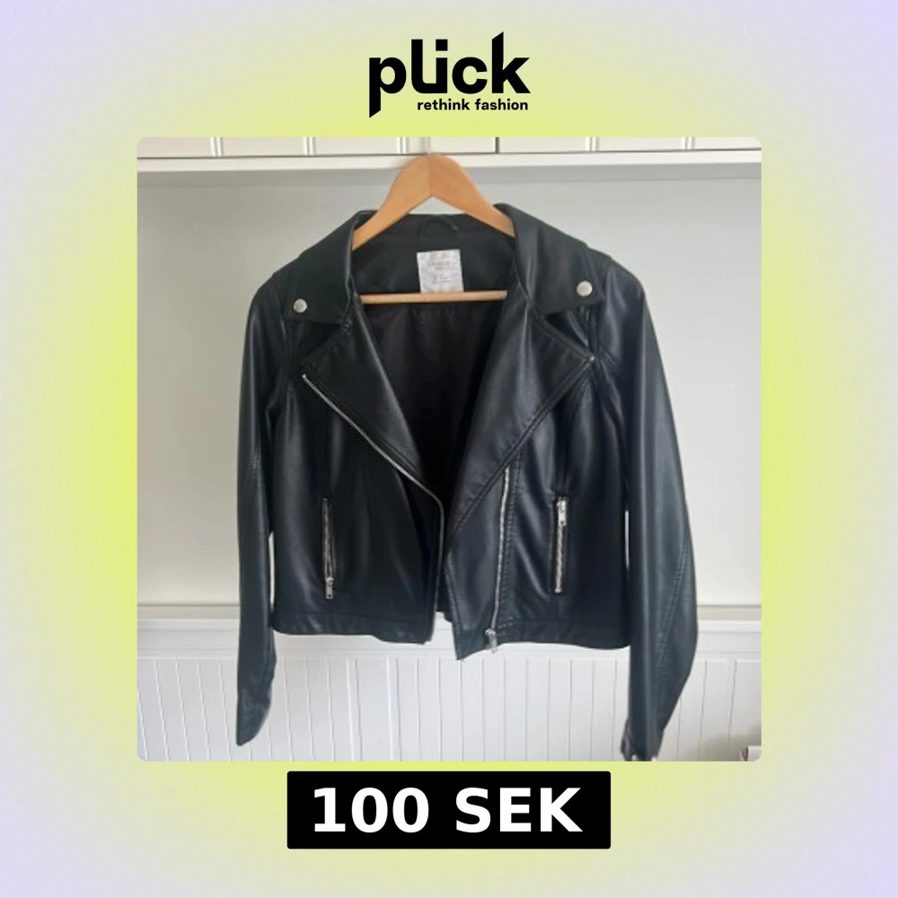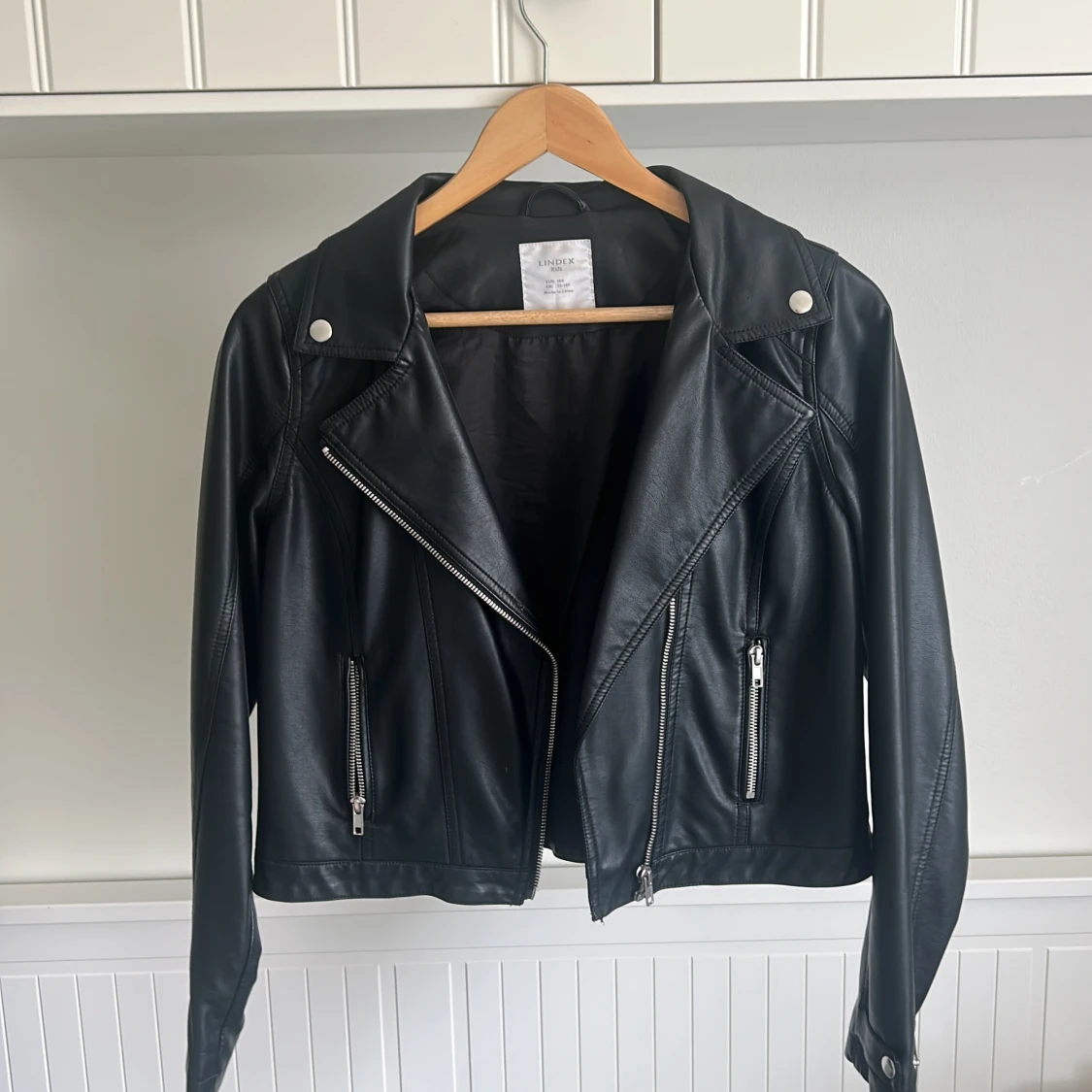 Säljer en svart skinnjacka med klassisk bikerstil. Jackan har silvriga dragkedjor framtill och vid fickorna samt bred krage med tryckknappar. Perfekt för en cool och tidlös look.Från Lindex