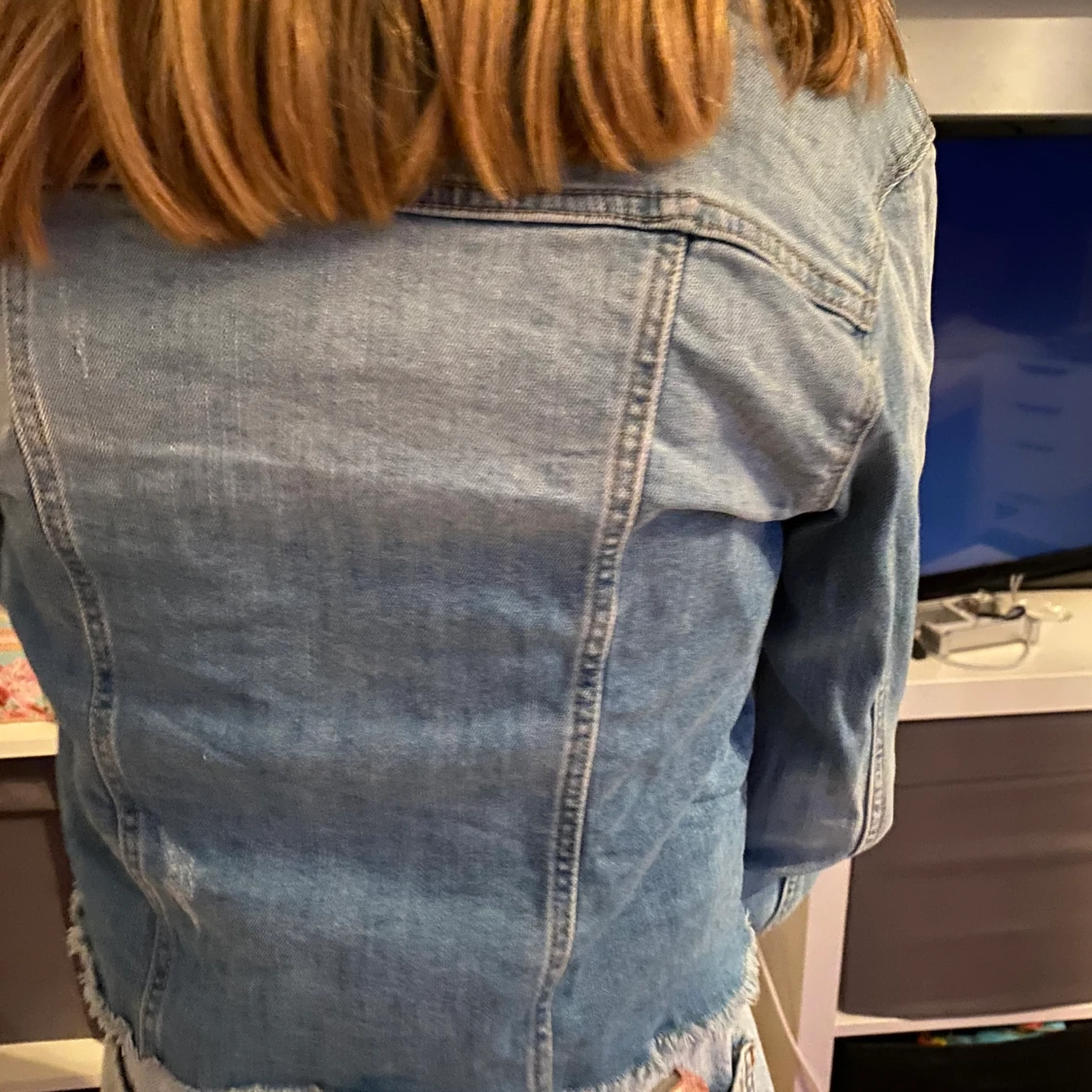 En blå jeansjacka med lite fransar längst ner. Knappar längst ner på ärmarna. Även en mörkblå ficka på vänstersidan. Frakt ingår.