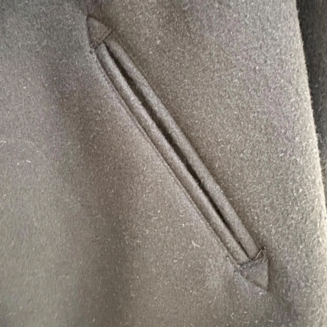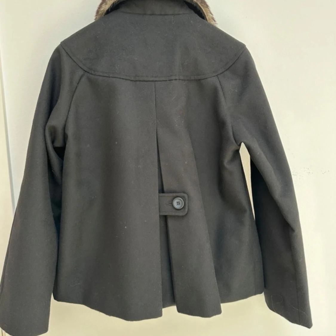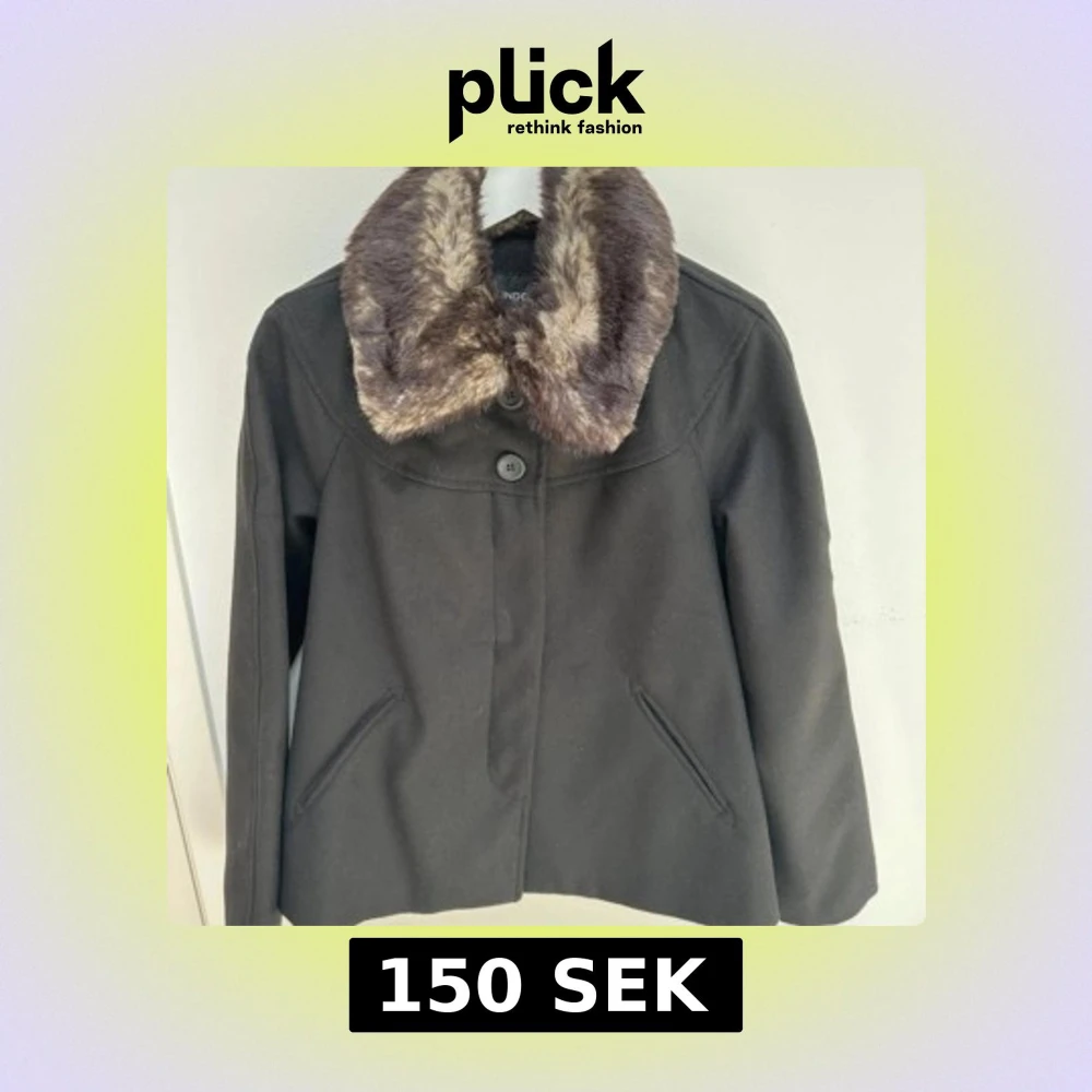 Snygg svart kappa från Lindex med en mjuk fuskpälsdetalj på kragen. Kappan har knappar framtill och en stilren design med en knappdetalj på baksidan. Perfekt för kyligare dagar med sitt prickiga foder. Använd en gång, som ny!